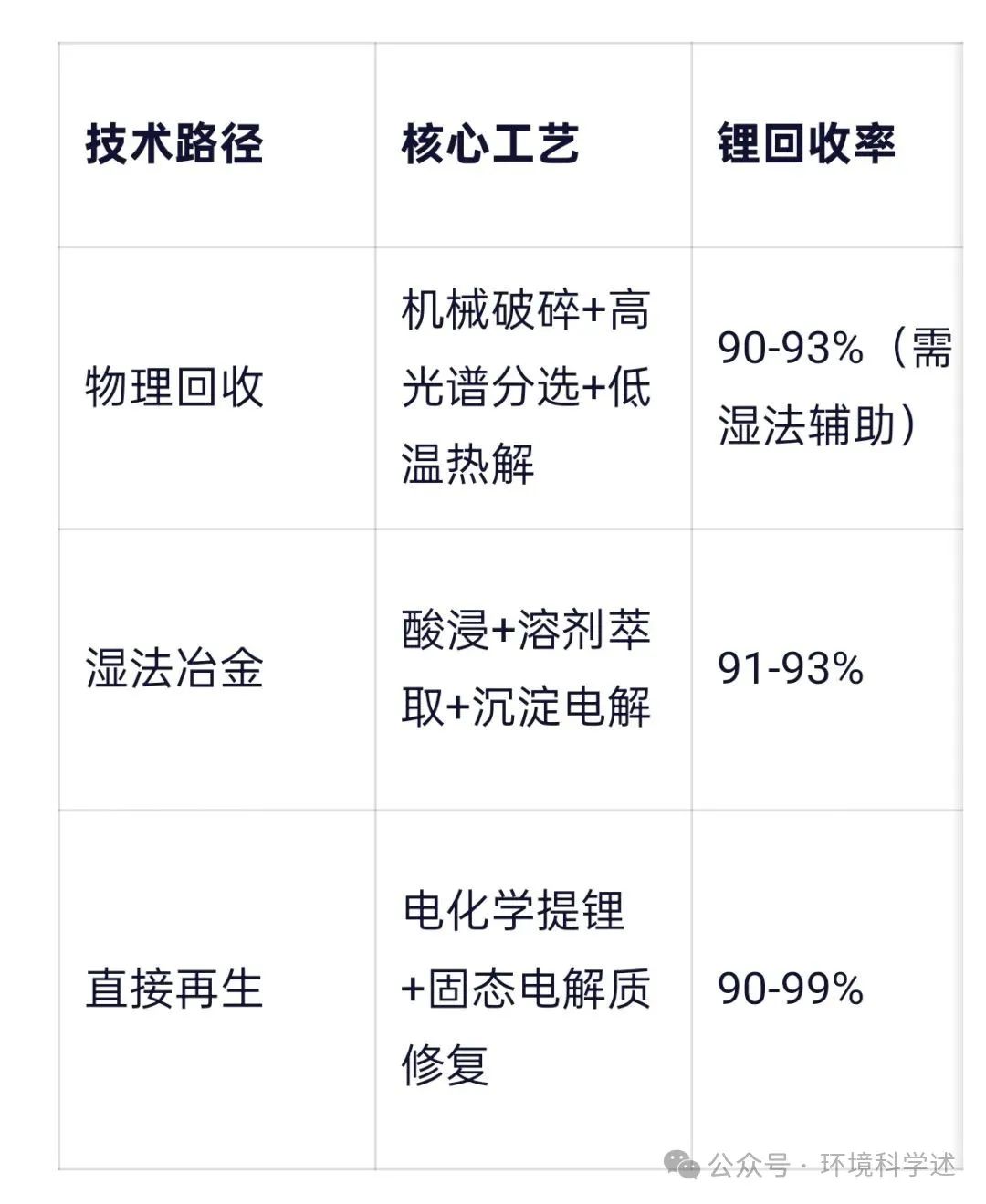 環(huán)保效益對(duì)比顯示,直接再生技術(shù)在減少污染方面具有明顯優(yōu)勢(shì)。鄭州大學(xué)技術(shù)避免了傳統(tǒng)濕法冶金、火法冶金回收過(guò)程中面臨的鋰資源流失、純度偏低、環(huán)境污染等問(wèn)題,僅產(chǎn)生水和乙二醇蒸汽等環(huán)保排放。振華設(shè)備的全封閉式破碎工藝配備三級(jí)廢氣處理裝置,使氟化物排放濃度控制在0.1mg/m3以下,僅為國(guó)標(biāo)限值的1/20。濕法冶金雖然回收率高,但每處理1噸三元電池可能產(chǎn)生30-50噸廢水,環(huán)保處理成本占總成本30%以上?;鸱ㄒ苯饎t面臨高能耗(11.06 MJ/kg)和二噁英排放風(fēng)險(xiǎn),目前僅作為輔助工藝使用。