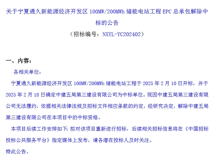 中國(guó)儲(chǔ)能網(wǎng)訊:6月10日,關(guān)于寧夏通久新能源經(jīng)濟(jì)開(kāi)發(fā)區(qū)100MW/200MWh儲(chǔ)能電站工程EPC總承包解除中標(biāo)的公告發(fā)布。公告稱(chēng),寧夏通久新能源經(jīng)濟(jì)開(kāi)發(fā)區(qū) 100MW/200MWh 儲(chǔ)能電站工程于2025年2月10日開(kāi)標(biāo),并于2025年2月18日確定中建五局第三建設(shè)有限公司為中標(biāo)單位?,F(xiàn)因中建五局第三建設(shè)有限公司無(wú)法履約,依據(jù)相關(guān)法律法規(guī)及招標(biāo)文件相應(yīng)條款的約定,經(jīng)研究決定,解除中建五局第三建設(shè)有限公司在本項(xiàng)目中的中標(biāo)資格。后續(xù)擬對(duì)該項(xiàng)目重新進(jìn)行招標(biāo)。