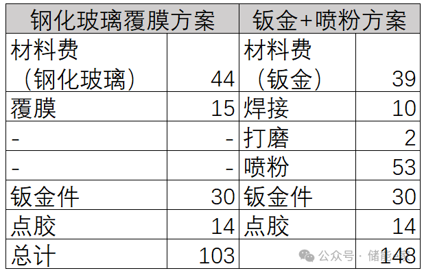 ▲鋼化玻璃覆膜方案與鈑金噴粉方案成本對(duì)比