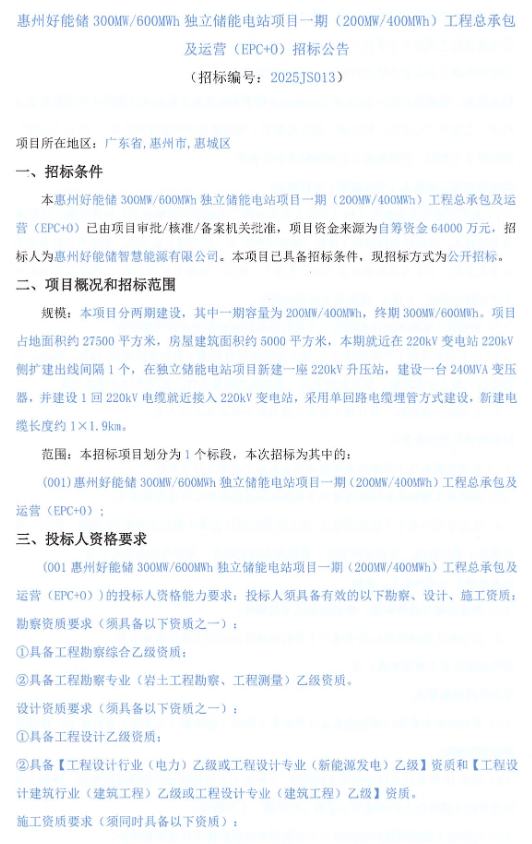 本招標(biāo)項(xiàng)目劃分為1個(gè)標(biāo)段,本次招標(biāo)為其中的:(001)惠州好能儲(chǔ)300WW/600MWh獨(dú)立儲(chǔ)能電站項(xiàng)目一期(200MT/400MWh)工程總承包及運(yùn)營(yíng)(EPC+O)。
