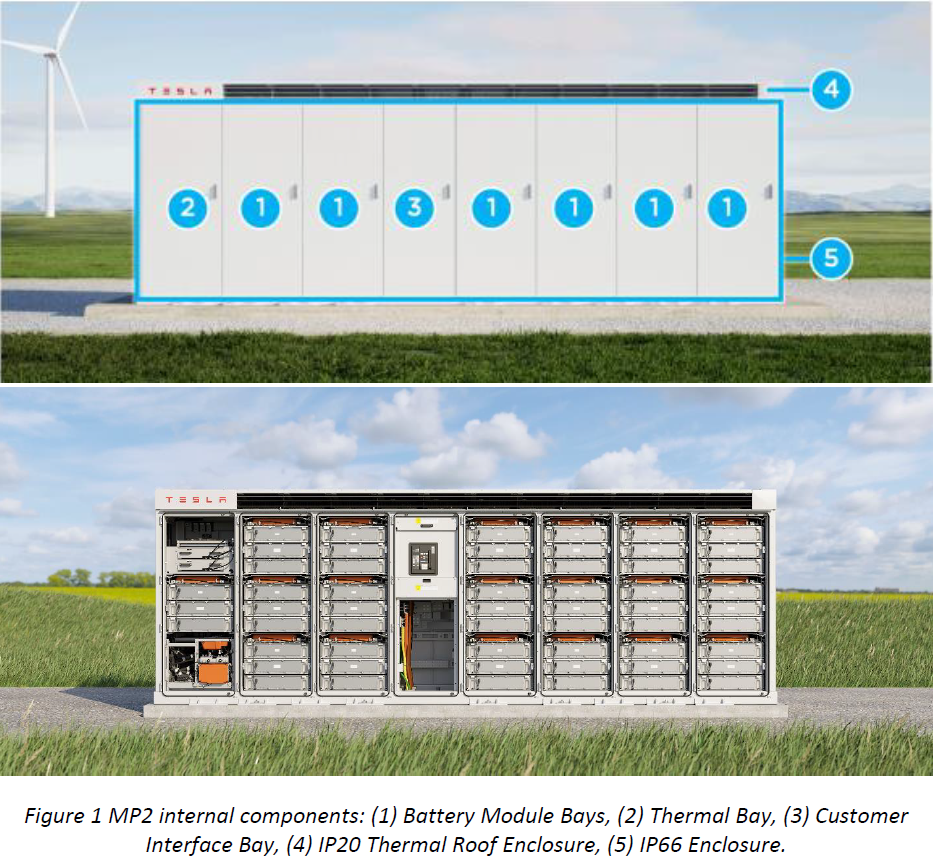 MP2XL是MP2的大容量版,MP2XL配備24個電池模塊,而MP2只有19個。除了更大尺寸以容納更多的電池模塊,MP2XL的設(shè)計幾乎與MP2相同。MP2XL使用與MP2完全相同的電池單體、電池模塊和電力電子設(shè)備(即內(nèi)部所有組件相同)。MP2XL與MP2一樣,由電池模塊、電力電子設(shè)備、熱管理系統(tǒng)和控制系統(tǒng)組成,所有系統(tǒng)預(yù)制化安裝在機柜內(nèi),機柜尺寸為長8800mm、深1650mm、高2785mm,重38.1t。MP2XL與MP2之間的其他細微差異包括:
