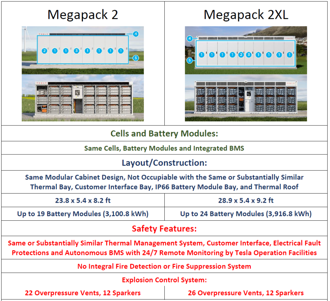 中國儲能網(wǎng)訊:特斯拉Megapack2和Megapack2XL(后續(xù)簡稱為MP2/MP2XL)是一種交流儲能艙。MP2是MP1的更新版本,采用類似的爆燃控制系統(tǒng),如壓敏通風(fēng)口和火花器系統(tǒng),以管理爆炸風(fēng)險。MP2XL是MP2的大容量版,采用相同的核心安全技術(shù)平臺(電池、通風(fēng)口、火花器系統(tǒng)等)。然而,MP2/MP2XL使用C廠的LFP電池,而不是MP1中使用的NMC和NCA電池。