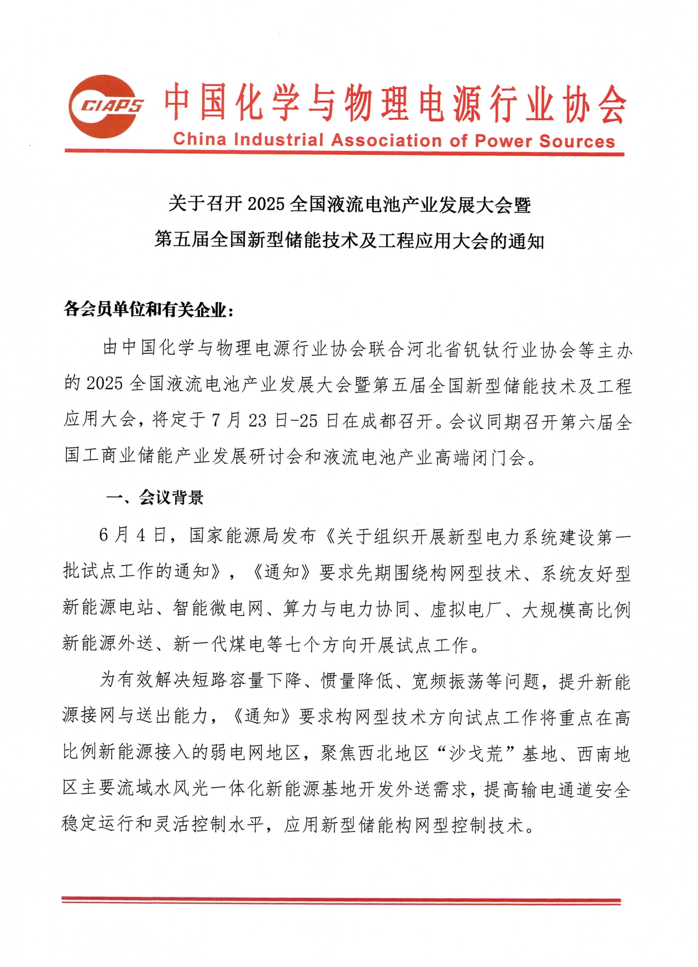 由中國化學與物理電源行業(yè)協(xié)會聯(lián)合河北省釩鈦行業(yè)協(xié)會等主辦的2025全國液流電池產(chǎn)業(yè)發(fā)展大會暨第五屆全國新型儲能技術及工程應用大會,將定于7月23日-25日在成都召開。會議同期召開第六屆全國工商業(yè)儲能產(chǎn)業(yè)發(fā)展研討會和液流電池產(chǎn)業(yè)高端閉門會。
