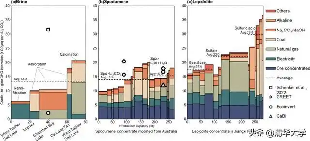 圖1.中國(guó)分工廠的電池級(jí)鋰碳足跡。(a)鹽湖提鋰(b)鋰輝石提鋰(c)鋰云母提鋰