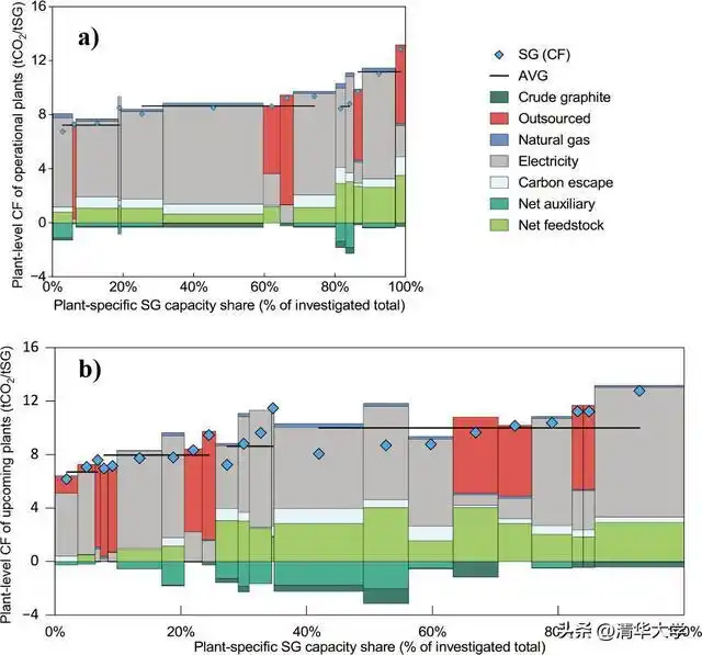 圖2.我國(guó)分工廠的電池級(jí)人造石墨碳足跡。(a)投產(chǎn)運(yùn)營(yíng)(b)擬建工廠