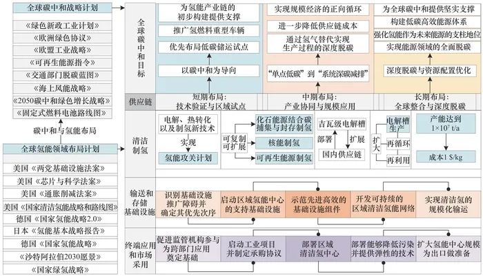 鑒于此,本文從供應(yīng)鏈全流程的角度出發(fā),深入探討國(guó)際氫能供應(yīng)鏈的三大關(guān)鍵環(huán)節(jié):氫氣制取(供應(yīng)鏈上游)、氫氣儲(chǔ)運(yùn)(供應(yīng)鏈中游)和氫氣應(yīng)用(供應(yīng)鏈下游),旨在系統(tǒng)揭示國(guó)際氫能產(chǎn)業(yè)階段性布局和供應(yīng)鏈傾向的內(nèi)在邏輯。一方面,聚焦于氫能發(fā)展與碳中和的實(shí)際關(guān)聯(lián),探討國(guó)際端在推動(dòng)氫能產(chǎn)業(yè)發(fā)展中的政策導(dǎo)向、資金投入和階段性發(fā)展目標(biāo);另一方面,從供應(yīng)鏈傾向?qū)用?,?xì)化產(chǎn)業(yè)鏈的技術(shù)關(guān)鍵節(jié)點(diǎn)、核心裝備及技術(shù)優(yōu)化路徑,強(qiáng)調(diào)政策與技術(shù)之間的協(xié)調(diào)性和互補(bǔ)性。進(jìn)一步地,通過(guò)對(duì)國(guó)際氫能產(chǎn)業(yè)細(xì)分領(lǐng)域的深入分析,揭示各環(huán)節(jié)在技術(shù)演進(jìn)、產(chǎn)業(yè)鏈協(xié)同及應(yīng)用落地中的突破點(diǎn);據(jù)此探討如何推動(dòng)國(guó)內(nèi)氫能供應(yīng)鏈的全鏈條優(yōu)化和布局調(diào)整,并提出對(duì)策建議,幫助優(yōu)化國(guó)內(nèi)氫能產(chǎn)業(yè)的戰(zhàn)略布局和技術(shù)路徑,以期推動(dòng)國(guó)內(nèi)外氫能產(chǎn)業(yè)的協(xié)同發(fā)展和跨國(guó)合作。
