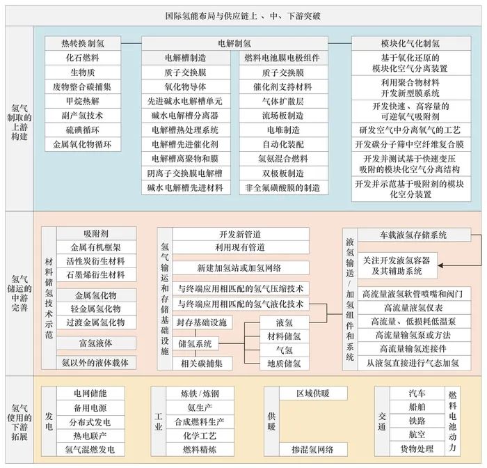 圖2 國(guó)際氫能布局與供應(yīng)鏈的上、中、下游突破