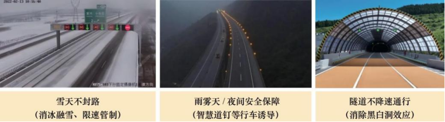 推動(dòng)公路交通基礎(chǔ)設(shè)施“四網(wǎng)融合”,運(yùn)用車(chē)路協(xié)同技術(shù),在實(shí)現(xiàn)道路精細(xì)感知、實(shí)時(shí)分析、用戶(hù)觸達(dá)的條件下,通過(guò)路側(cè)設(shè)備的感知能力向車(chē)輛發(fā)送超視距的行車(chē)誘導(dǎo)信息,如道路邊界、標(biāo)志標(biāo)牌信息、周邊車(chē)輛實(shí)時(shí)位置和態(tài)勢(shì)信息、車(chē)道偏離警告等,允許具備實(shí)時(shí)車(chē)路通信功能的車(chē)輛上路行駛;布設(shè)各類(lèi)冰雪消融設(shè)施設(shè)備和加強(qiáng)惡劣天氣行車(chē)引導(dǎo),可以減少惡劣天氣帶來(lái)的高速公路無(wú)法通行情況,進(jìn)而提升公路路網(wǎng)的韌性和抗干擾能力。