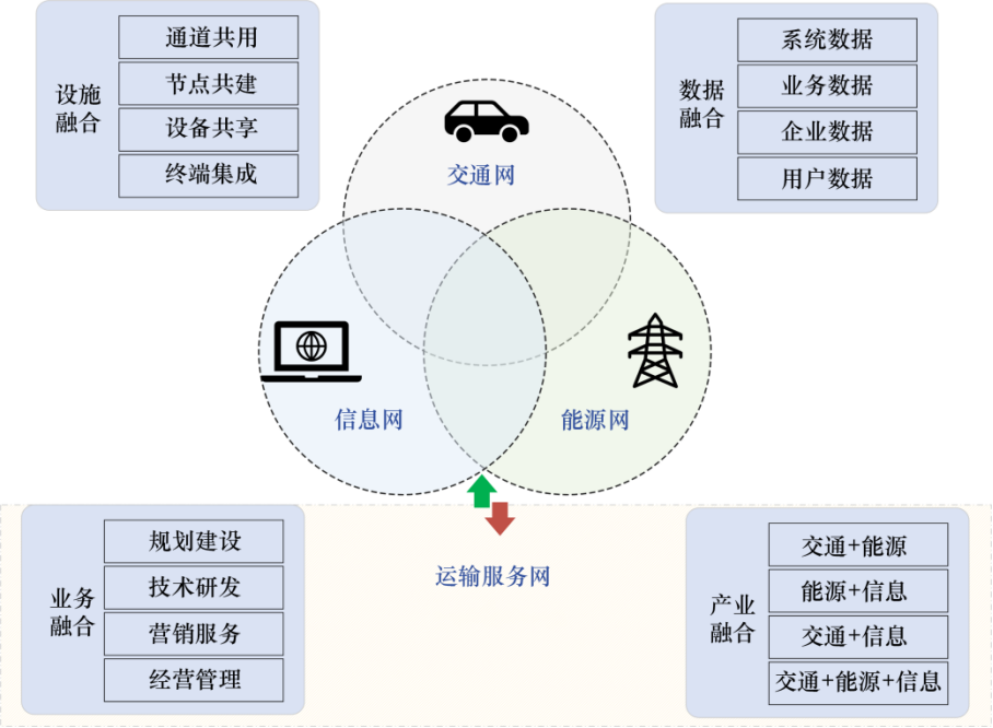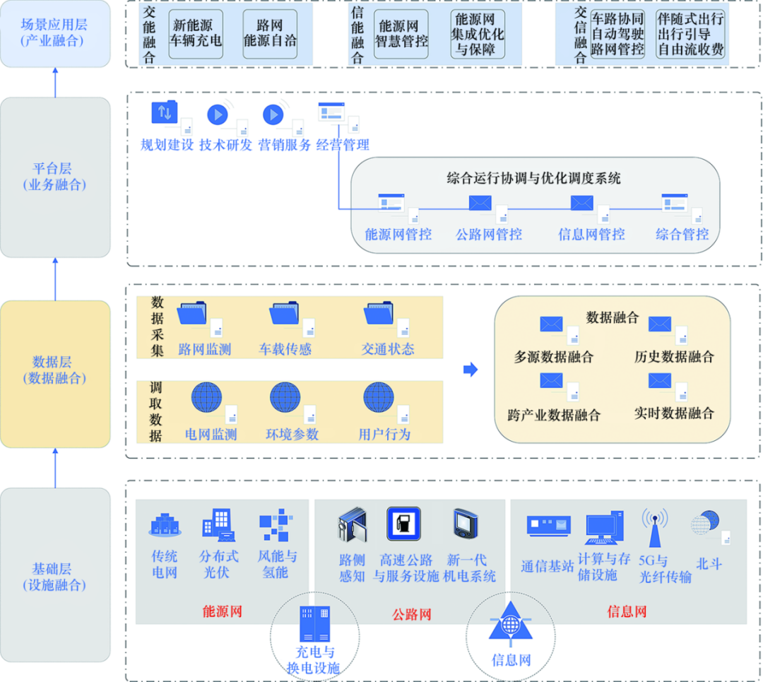 通過(guò)物理層的協(xié)同發(fā)展,推動(dòng)“四網(wǎng)”在通道、樞紐、設(shè)備和終端等層次的共享,主要體現(xiàn)在公路交通基礎(chǔ)設(shè)施的通道共用、樞紐共建、設(shè)備共享、終端集成等方面。① 通道共用。能源網(wǎng)需要建設(shè)電力塔鋪設(shè)架空線路,信息網(wǎng)需要建設(shè)通信塔鋪設(shè)光纜或掛載基站,電力塔、通信塔是能源網(wǎng)和信息網(wǎng)空中走廊的重要節(jié)點(diǎn)。推動(dòng)電力塔和通信塔“雙塔合一”,可以提高通信光纜和基站建設(shè)效率,降低建設(shè)成本,減少新增通信鐵塔基站占用土地資源,促進(jìn)綠色協(xié)調(diào)發(fā)展。② 樞紐共建。能源網(wǎng)有能源基地、變電站/換流站等能量生產(chǎn)和轉(zhuǎn)換樞紐;交通網(wǎng)有人流、物流集散中心等客/貨運(yùn)樞紐,以及大量加油站、充(換)電站等能量補(bǔ)給節(jié)點(diǎn);信息網(wǎng)有大量通信基站等信息傳輸節(jié)點(diǎn)以及服務(wù)器、數(shù)據(jù)中心等信息存儲(chǔ)與交換樞紐。推動(dòng)變電站與充(換)電站以及信息數(shù)據(jù)中心、客貨運(yùn)輸樞紐與充(換)電站、能源基地與信息數(shù)據(jù)中心等形式的樞紐或節(jié)點(diǎn)共建,通過(guò)樞紐共建,提高土地和空間等資源的利用效率,降低建設(shè)成本,增強(qiáng)公路交通基礎(chǔ)設(shè)施“四網(wǎng)融合”的系統(tǒng)功能并提高運(yùn)行水平。③ 設(shè)備共享。公路交通基礎(chǔ)設(shè)施、運(yùn)輸服務(wù)、能源、信息“四網(wǎng)”的覆蓋范圍大、設(shè)備數(shù)量多,實(shí)現(xiàn)設(shè)備功能集成,將帶來(lái)顯著的經(jīng)濟(jì)和環(huán)境效益。智慧路燈、電力光纖、載波通信、傳感測(cè)量裝置等的集成是設(shè)備融合的重點(diǎn)。智慧路燈能夠集成照明、基站、監(jiān)控、充電等功能,是智慧城市的基礎(chǔ)智能單位;電力光纖和載波通信可以實(shí)現(xiàn)電力、信息傳輸合二為一,提高設(shè)備利用效率;傳感測(cè)量裝置的共用能夠推動(dòng)設(shè)備信息共享,提高系統(tǒng)運(yùn)行效率。④ 終端集成。終端是“四網(wǎng)”實(shí)現(xiàn)商業(yè)價(jià)值的重要手段。信息網(wǎng)的終端主要包括計(jì)算機(jī)、智能手機(jī)等,能源網(wǎng)的終端主要有智能家居等用電設(shè)備、智能電能表等信息采集設(shè)備,交通網(wǎng)的終端主要包括各類(lèi)交通工具及車(chē)載系統(tǒng)等。終端融合主要包括硬件集成和軟件集成,前者依托芯片和材料技術(shù),實(shí)現(xiàn)單個(gè)終端集成多個(gè)硬件功能應(yīng)用,后者是將多個(gè)軟件功能集成到同一個(gè)軟件里。