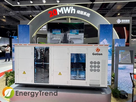 國軒高科展出了20MWh乾元智儲系統(tǒng),該系統(tǒng)搭載的是314Ah電芯,通過優(yōu)化系統(tǒng)Pack并聯(lián)設計和散熱布局,最終實現(xiàn)單體集裝箱20MWh容量的突破。