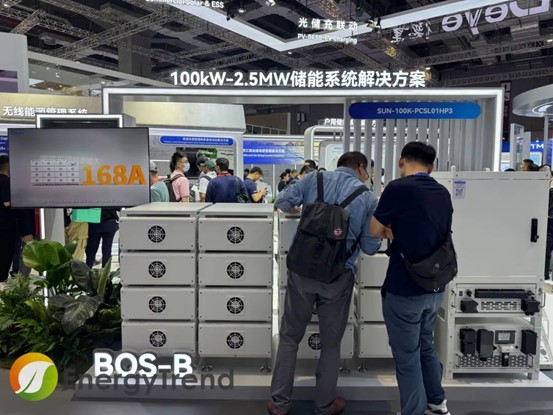 德業(yè)展出了多款新品,包含戶用光儲、工商業(yè)光儲、陽臺(微型)光儲、光儲充一體化等領域,其中100kW-2.5MW模塊化工業(yè)級解決方案,由500kW STS搭配多臺100kW/125kW PCS模塊,匹配BOS-B系列215kWh儲能電池,還可以選配200kWp光伏模塊,實現(xiàn)對2.5MW以下工商業(yè)儲能系統(tǒng)功率、電池容量、光伏裝機量的靈活適應。