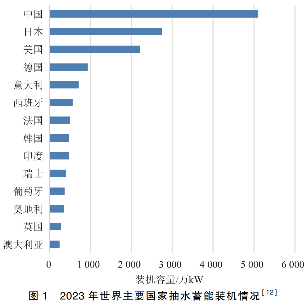 截至2023年底,全球抽水蓄能裝機(jī)容量達(dá)到17 913萬(wàn)kW[11]。其中,我國(guó)抽水蓄能裝機(jī)容量5 094萬(wàn)kW,居世界首位;日本、美國(guó)的抽水蓄能裝機(jī)容量分別為2316萬(wàn)、2189萬(wàn)kW,分列第2位和第3位。全球抽水蓄能裝機(jī)容量排名前十的國(guó)家分別為中國(guó)、日本、美國(guó)、德國(guó)、意大利、西班牙、法國(guó)、韓國(guó)、印度、瑞士,如圖1所示[12]。
