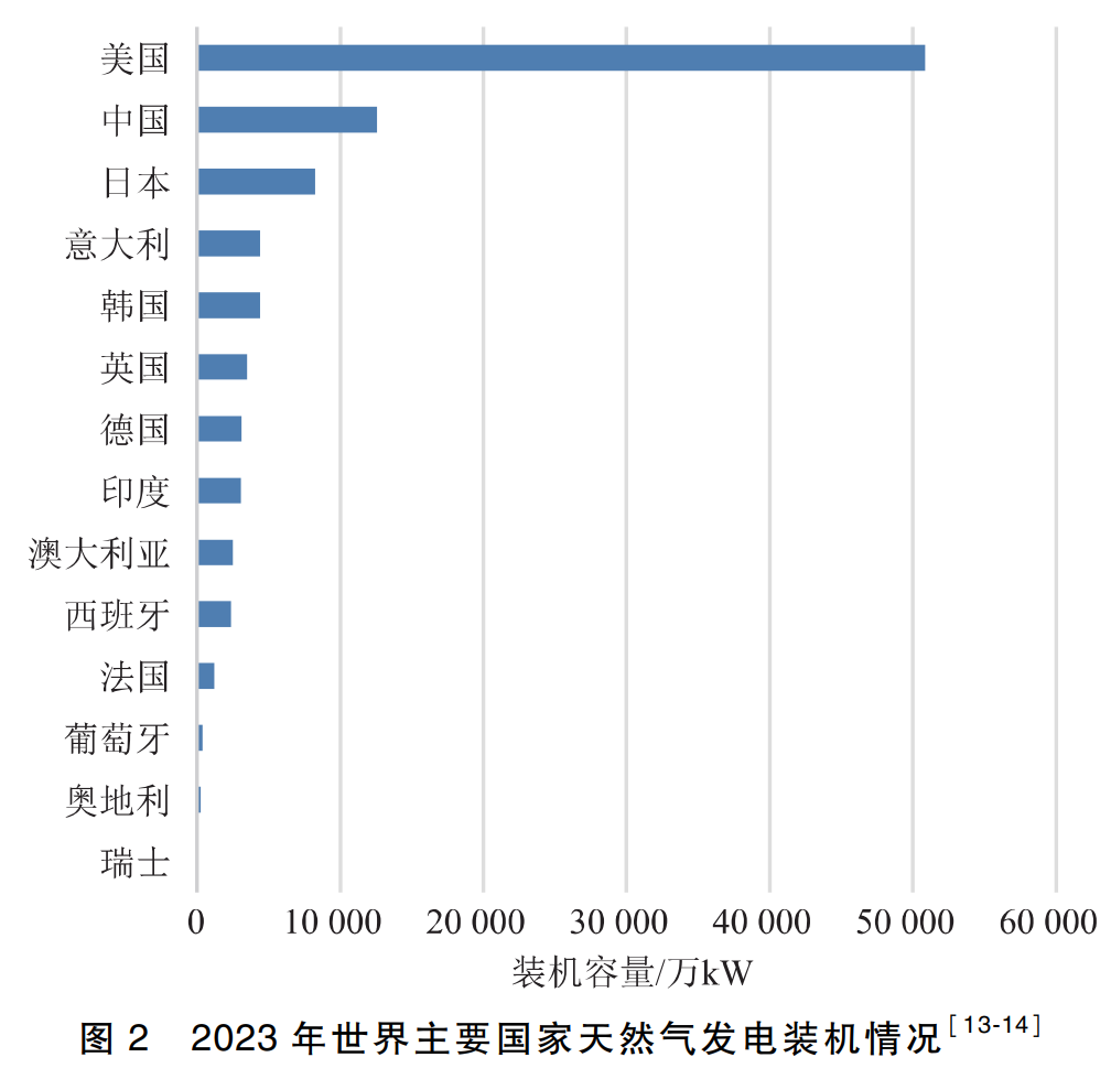 截至2023年底,中國(guó)、美國(guó)、日本、意大利等主要國(guó)家的天然氣發(fā)電裝機(jī)容量如圖2所示[13-14]。其中,奧地利、葡萄牙、法國(guó)、西班牙、德國(guó)、意大利的燃?xì)獍l(fā)電裝機(jī)容量根據(jù)天然氣發(fā)電量估算。