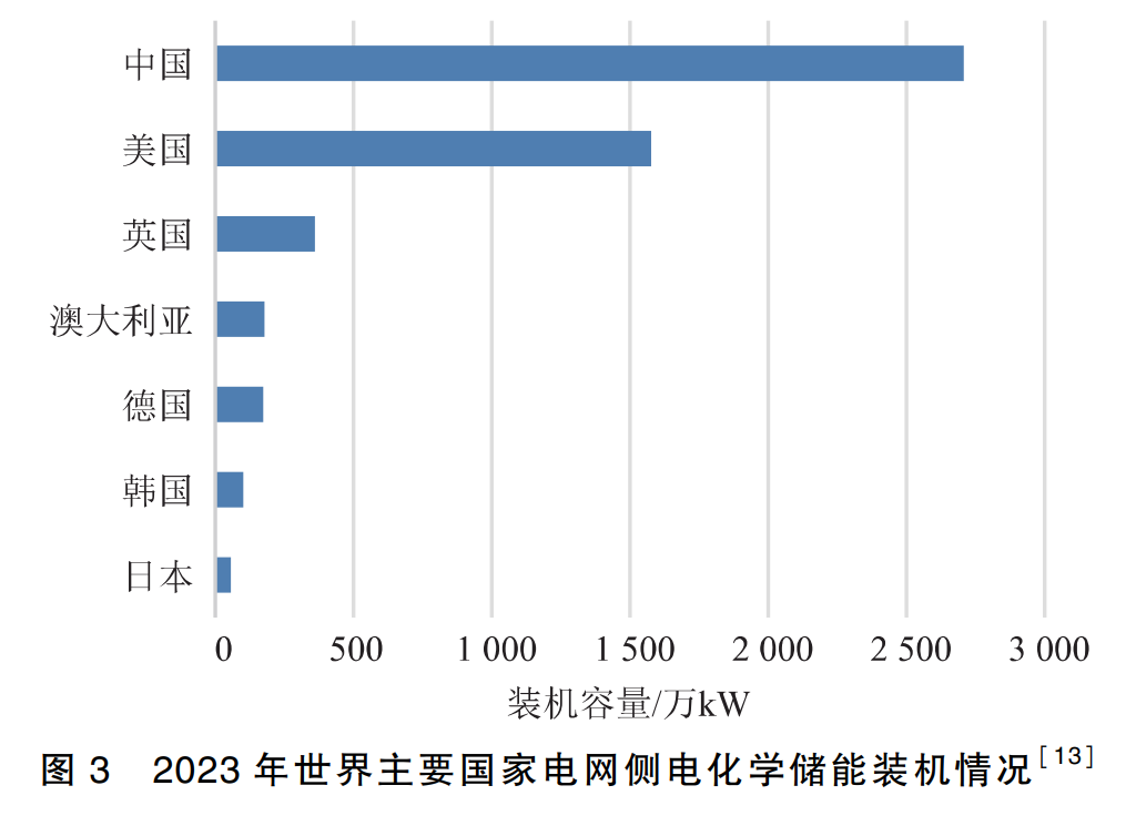 截至2023年底,全球電化學(xué)儲(chǔ)能裝機(jī)容量達(dá)到9130萬(wàn)kW。從裝機(jī)容量和儲(chǔ)能量占比來(lái)看,抽水蓄能仍是儲(chǔ)能領(lǐng)域的主力軍,但近年來(lái)新型儲(chǔ)能也得到了較快發(fā)展。2021年,全球新增投運(yùn)新型儲(chǔ)能項(xiàng)目首次突破1000萬(wàn)kW,累計(jì)裝機(jī)達(dá)到2540萬(wàn)kW。2022年,全球新型儲(chǔ)能累計(jì)裝機(jī)規(guī)模達(dá)4570萬(wàn)kW,年增長(zhǎng)率80%,鋰離子電池占據(jù)絕對(duì)主導(dǎo)地位,以用戶側(cè)和電源側(cè)為主[15]。根據(jù)Bp能源統(tǒng)計(jì)數(shù)據(jù),截至2023年底,世界主要國(guó)家電網(wǎng)側(cè)電化學(xué)儲(chǔ)能裝機(jī)容量如圖3所示[13]。