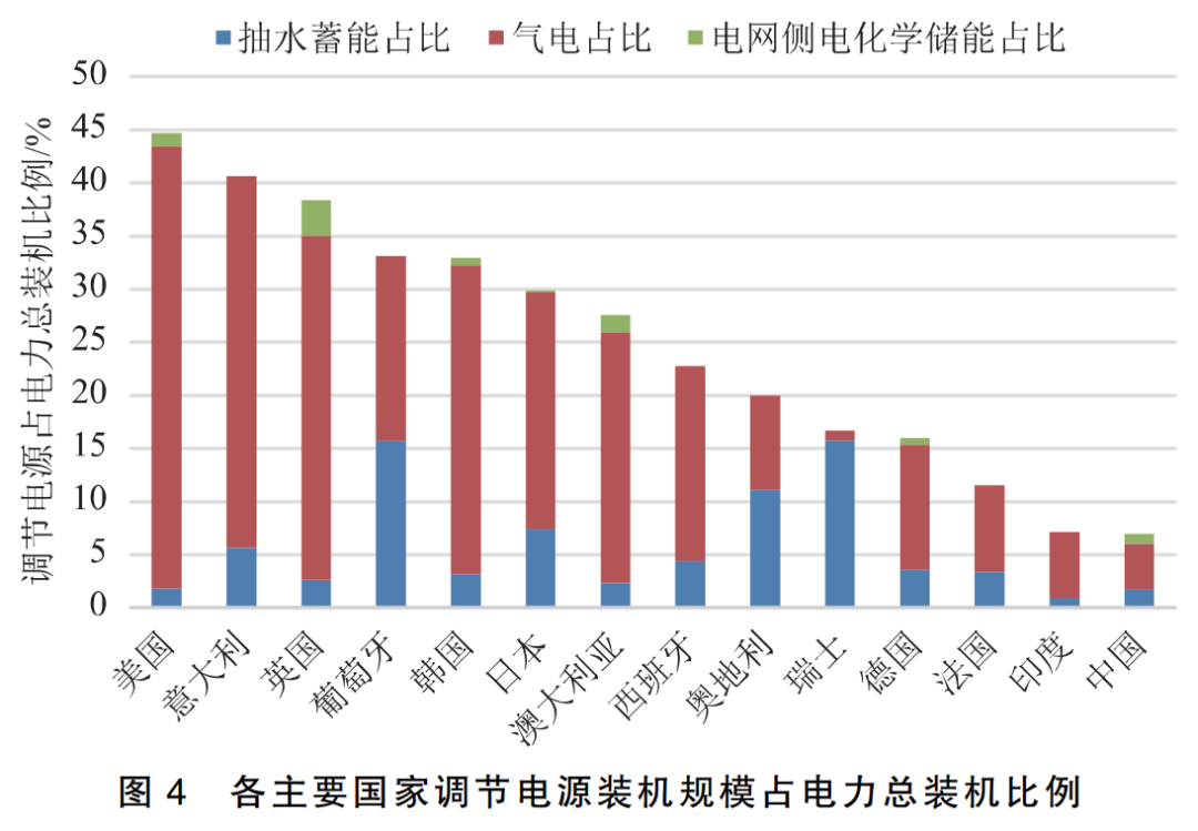 分析世界主要國(guó)家電力系統(tǒng)總裝機(jī)容量、抽水蓄能裝機(jī)容量、天然氣發(fā)電裝機(jī)容量和電網(wǎng)側(cè)電化學(xué)儲(chǔ)能裝機(jī)容量,世界各國(guó)調(diào)節(jié)電源裝機(jī)容量占電力系統(tǒng)總裝機(jī)容量比例如圖4所示,其中,美國(guó)最高,調(diào)節(jié)電源占比為45%;意大利、英國(guó)、葡萄牙、韓國(guó)次之,調(diào)節(jié)電源占比分別為41%、38%、33%、33%;我國(guó)最低,調(diào)節(jié)電源占比僅為7%,因此,我國(guó)新能源消納能力受到很大限制,為了支撐新能源大規(guī)模發(fā)展和高比例消納需要大力發(fā)展調(diào)節(jié)電源[16-19]。