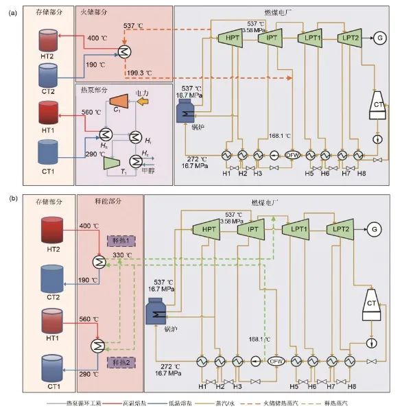 圖1 耦合火電廠靈活調(diào)峰的卡諾電池儲(chǔ)能系統(tǒng):(a) 儲(chǔ)能過程;(b) 釋能過程