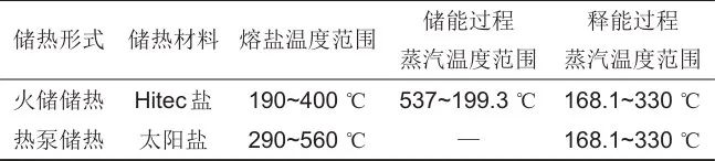 釋能過程:如圖1(b)所示,汽輪機(jī)組除氧器OFW的部分蒸汽被引出,經(jīng)過HT1中的太陽鹽或HT2中的Hitec鹽加熱,然后送回低壓缸LPT1入口做功。用電高峰期時(shí),可同時(shí)利用鍋爐和熱鹽罐釋放熱量與蒸汽換熱來發(fā)電。表1總結(jié)了儲(chǔ)熱部分中不同儲(chǔ)熱形式對(duì)應(yīng)的儲(chǔ)熱材料和溫度范圍。