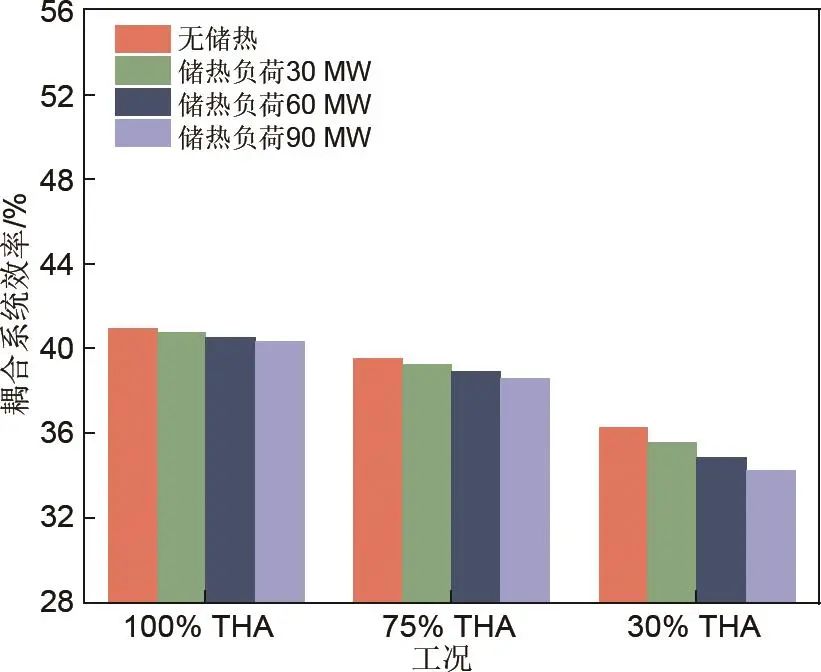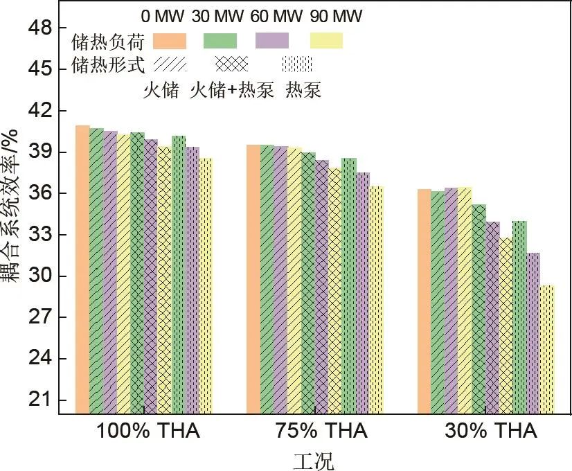 耦合系統(tǒng)在儲(chǔ)能過程中可以通過火儲(chǔ)儲(chǔ)熱,也可以通過熱泵循環(huán)儲(chǔ)熱。因此,分析了30%THA、75%THA和100%THA三種工況下,純火儲(chǔ)、火儲(chǔ)-熱泵聯(lián)合以及純熱泵三種儲(chǔ)能方式性能表現(xiàn),并探討了不同耦合方案的影響。