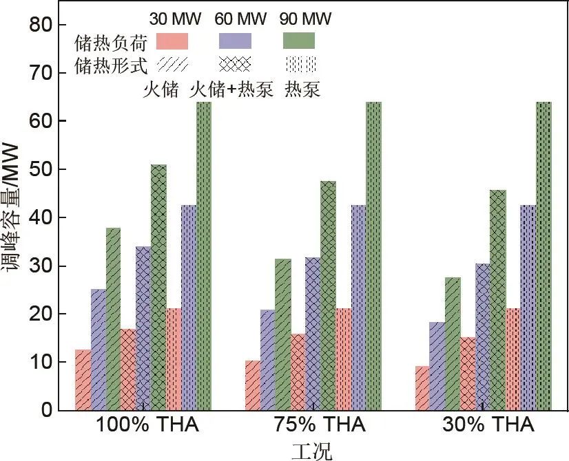圖2~圖4展示了不同負(fù)荷和不同儲(chǔ)能方式下儲(chǔ)能過程的系統(tǒng)效率、調(diào)峰容量和調(diào)峰深度。由圖2可以看出,由于蒸汽與熔鹽之間的換熱存在損失,通過儲(chǔ)熱建立的冷熱源之間的溫差相較于蒸汽放熱前后的溫差更小。因此,火儲(chǔ)儲(chǔ)熱方式會(huì)降低耦合系統(tǒng)在儲(chǔ)能過程的系統(tǒng)效率,且電廠負(fù)荷和儲(chǔ)熱負(fù)荷越高,系統(tǒng)效率降低得越明顯,100%THA,90 MW儲(chǔ)熱負(fù)荷時(shí),耦合系統(tǒng)效率降低0.64%。熱泵儲(chǔ)熱方式能夠直接利用汽輪機(jī)發(fā)電進(jìn)行儲(chǔ)熱,其在單位儲(chǔ)熱負(fù)荷下的對(duì)電廠發(fā)電的降低量更為顯著,因此耦合系統(tǒng)效率降低得也更顯著,100%THA,90 MW純熱泵儲(chǔ)熱負(fù)荷時(shí),耦合系統(tǒng)效率相較于無儲(chǔ)熱情況降低了2.35%。由圖3和圖4可以看出,調(diào)峰容量和調(diào)峰深度與儲(chǔ)熱負(fù)荷和電廠負(fù)荷均呈現(xiàn)正相關(guān)關(guān)系。得益于對(duì)汽輪機(jī)發(fā)電的直接利用,純熱泵儲(chǔ)熱在調(diào)峰容量和調(diào)峰深度方面更具優(yōu)勢(shì),其調(diào)峰容量和調(diào)峰深度在儲(chǔ)熱負(fù)荷為90 MW時(shí)取得最高值,分別可達(dá)63.97 MW和10.65%。儲(chǔ)能過程中,火儲(chǔ)儲(chǔ)熱,火儲(chǔ)-熱泵聯(lián)合儲(chǔ)熱和熱泵儲(chǔ)熱方式單位負(fù)荷的最大調(diào)峰容量分別為0.42 MW,0.57 MW和0.71 MW。