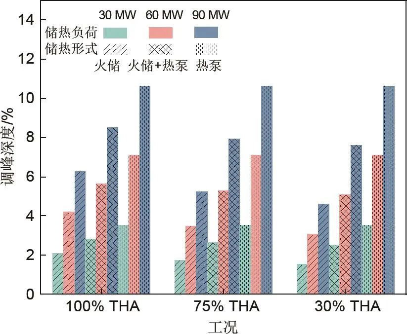 圖5和圖6分別為釋能過程中不同儲(chǔ)熱負(fù)荷下的系統(tǒng)效率,調(diào)峰容量和調(diào)峰深度。從圖5可以看出,由于熔鹽與蒸汽換熱時(shí)存在溫差損失,釋能過程耦合系統(tǒng)的效率相較于無儲(chǔ)熱的電廠熱效率更低,且隨著儲(chǔ)熱負(fù)荷的增加,釋能過程的系統(tǒng)效率逐漸減小。此外,當(dāng)電廠以更高的負(fù)荷運(yùn)行時(shí),儲(chǔ)熱負(fù)荷的變化對(duì)于系統(tǒng)效率的影響更小,當(dāng)電廠為100%THA,儲(chǔ)熱負(fù)荷為90 MW時(shí),耦合系統(tǒng)效率降低量?jī)H為0.63%,而電廠為30%THA,儲(chǔ)熱負(fù)荷為30 MW時(shí),耦合系統(tǒng)效率降低量則為2.05%。由圖6可以看出,釋能過程的調(diào)峰容量及調(diào)峰深度與儲(chǔ)熱負(fù)荷和電廠負(fù)荷均呈現(xiàn)正相關(guān)關(guān)系。釋能過程中,不同電廠運(yùn)行負(fù)荷下,單位儲(chǔ)熱負(fù)荷的調(diào)峰容量依次為0.30 MW,0.26 MW和0.23 MW。