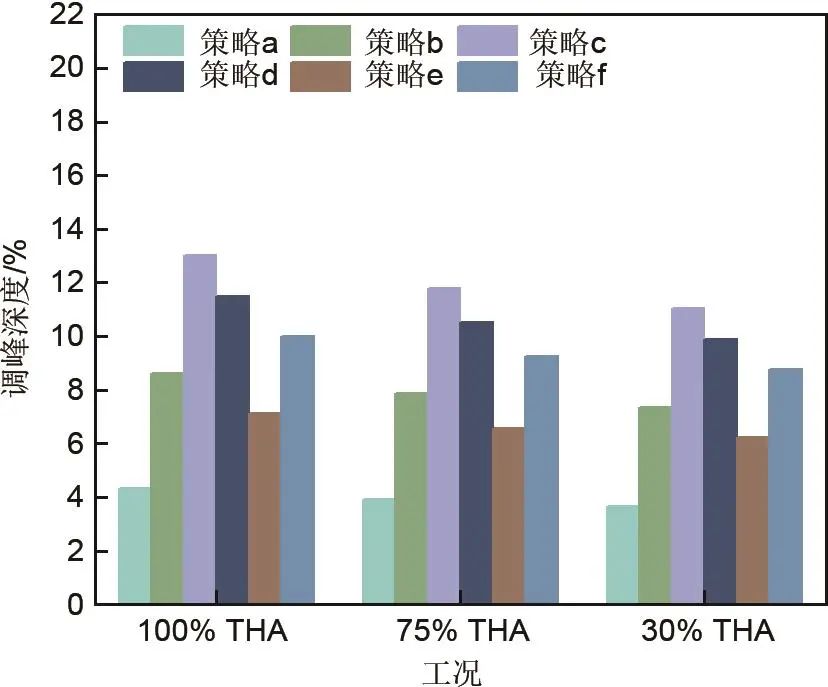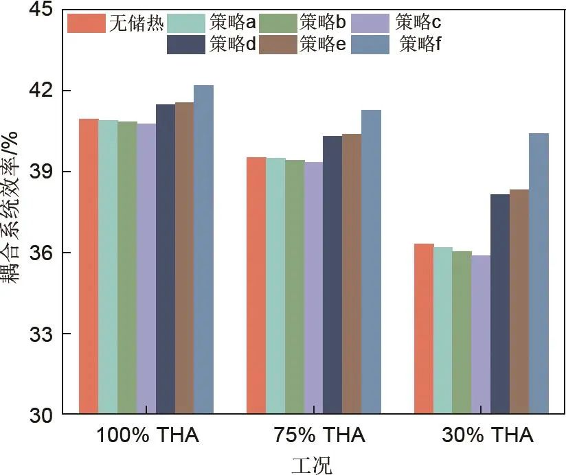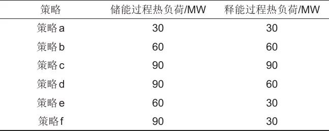 表2展示了根據(jù)儲(chǔ)/釋能過程中不同熱負(fù)荷制定的6種全過程運(yùn)行策略。圖7~9分別為火儲(chǔ)-熱泵聯(lián)合的儲(chǔ)熱形式在不同儲(chǔ)能釋能策略下全過程的系統(tǒng)效率、調(diào)峰容量和調(diào)峰深度。從圖7可以看出,儲(chǔ)能過程和釋能過程熱負(fù)荷相同時(shí),耦合系統(tǒng)循環(huán)效率隨著儲(chǔ)熱負(fù)荷的提高而降低,但降幅較小,當(dāng)儲(chǔ)釋熱負(fù)荷為90 MW時(shí),100%THA運(yùn)行的循環(huán)過程僅有0.16%的效率降低,而通過圖8和圖9可以看出,此時(shí)的調(diào)峰容量和調(diào)峰深度則可達(dá)78.29 MW和13.04%。因此,儲(chǔ)熱的增加對(duì)于電廠的靈活運(yùn)行是有利的。當(dāng)儲(chǔ)能過程熱負(fù)荷一定時(shí),釋能過程熱負(fù)荷越低,耦合系統(tǒng)效率越高;當(dāng)釋能過程熱負(fù)荷一定時(shí),儲(chǔ)能過程熱負(fù)荷越高耦合系統(tǒng)效率越高。這是由于釋熱過程中未利用的部分,可以作為備用熱源,用于其他場(chǎng)景。從圖8和圖9可以看出,儲(chǔ)/釋能過程熱負(fù)荷越高的策略,耦合系統(tǒng)的調(diào)峰容量和調(diào)峰深度也越大,如100%THA、75%THA和30%THA工況下的調(diào)峰容量和調(diào)峰深度最大的均為策略c,然而此時(shí)的系統(tǒng)效率在不同電廠運(yùn)行工況下均為最低。當(dāng)電廠以不同負(fù)荷運(yùn)行時(shí),對(duì)于儲(chǔ)釋熱負(fù)荷相同的a,b和c三個(gè)運(yùn)行策略,其儲(chǔ)/釋能循環(huán)過程的單位熱負(fù)荷調(diào)峰容量依次為0.87 MW,0.79 MW和0.74 MW。