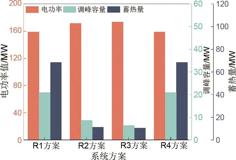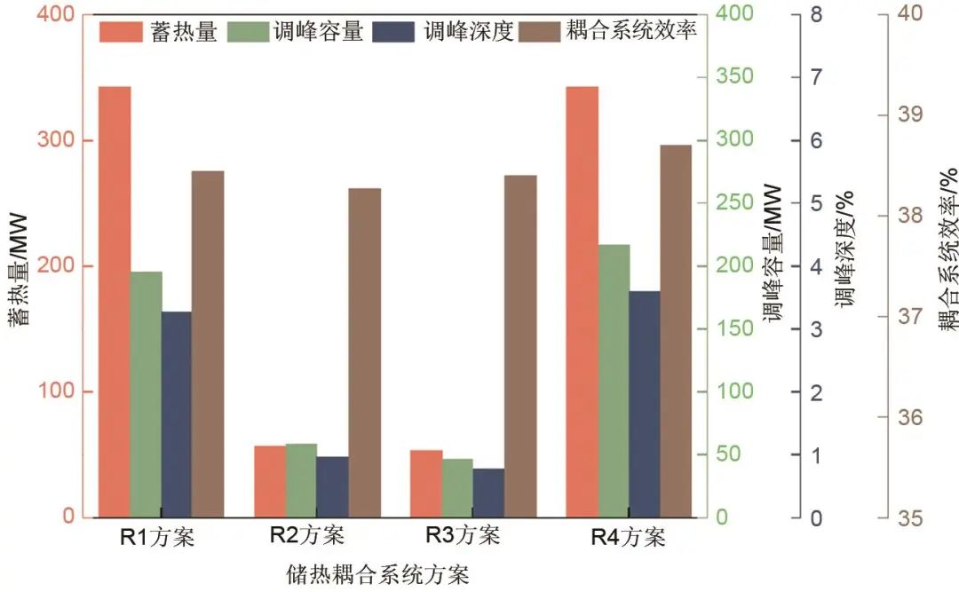 圖10和圖11展示了四種方案在30%THA工況下抽取相同蒸汽流量時(shí)耦合系統(tǒng)的電功率、調(diào)峰容量、蓄熱量、系統(tǒng)效率和調(diào)峰深度。可以看出,當(dāng)從中壓缸抽取再熱蒸汽,并在其放熱后返回除氧器時(shí),會(huì)同時(shí)降低蒸汽在中壓缸和低壓缸的做功,導(dǎo)致汽輪機(jī)輸出功率降低顯著,為21.03 MW。但由于此時(shí)抽取的蒸汽放熱充分,因此調(diào)峰容量、調(diào)峰深度和蓄熱量更大。當(dāng)抽取主蒸汽或再熱蒸汽,并在其釋熱后返回低壓缸入口時(shí),僅會(huì)降低蒸汽在中壓缸的做功,對(duì)汽輪機(jī)的輸出功率影響不明顯,如方案R3,僅能降低6.54 MW。此外,當(dāng)電廠以低負(fù)荷運(yùn)行時(shí),更大的蓄熱量對(duì)耦合系統(tǒng)效率的貢獻(xiàn)更為顯著。在方案R1和R4中,其蓄熱量為68.51 MW,使得耦合系統(tǒng)效率相較于無儲(chǔ)熱配置電廠效率提高0.12%。儲(chǔ)能過程中,方案R1~R4的單位儲(chǔ)熱負(fù)荷的調(diào)峰容量分別為0.31 MW,0.77 MW,0.61 MW和0.31 MW。可以看出,方案R2的儲(chǔ)熱模式能夠以更低的儲(chǔ)熱負(fù)荷實(shí)現(xiàn)儲(chǔ)能過程中更高的調(diào)峰性能。