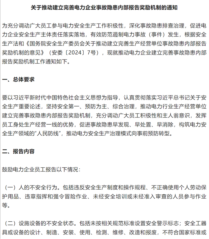 中國儲能網(wǎng)訊:當新型儲能裝機規(guī)模即將沖破80吉瓦大關,中國電力行業(yè)也站在了歷史性跨越的關口。國家能源局6月9日重磅落子的《關于推動建立完善電力企業(yè)事故隱患內(nèi)部報告獎勵機制的通知》,猶如在能源轉(zhuǎn)型的澎湃浪潮中筑起一道全員參與的安全堤壩。