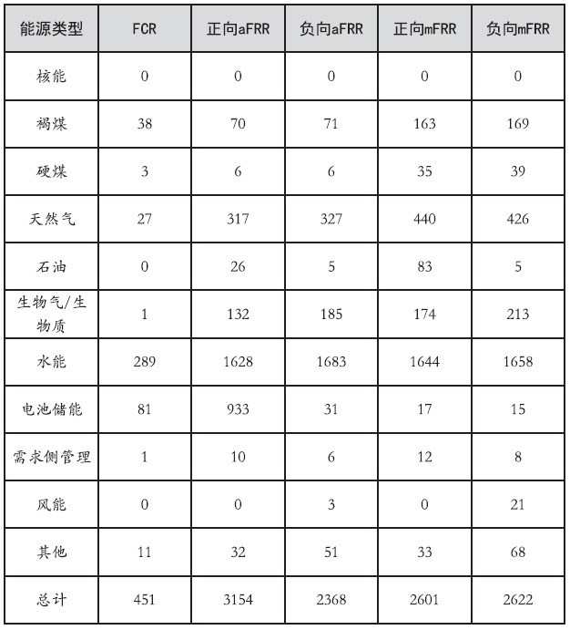 在參與平衡市場(chǎng)之前,平衡服務(wù)提供者必須通過(guò)輸電運(yùn)營(yíng)商認(rèn)證,四大輸電運(yùn)營(yíng)商會(huì)統(tǒng)計(jì)預(yù)先審核合格的資源。不同類(lèi)型的發(fā)用電資源都可以參與預(yù)資格認(rèn)證。同時(shí),明確了“聚合商”法律地位,允許其作為平衡單元以外的獨(dú)立主體參與平衡市場(chǎng)投標(biāo),最小投標(biāo)門(mén)檻降至5兆瓦,這有助于充電樁運(yùn)營(yíng)商等各類(lèi)型虛擬電廠技術(shù)服務(wù)商在市場(chǎng)中發(fā)揮作用并獲利。德國(guó)不同類(lèi)型平衡服務(wù)種類(lèi)和平衡資源按容量的統(tǒng)計(jì)如表2。