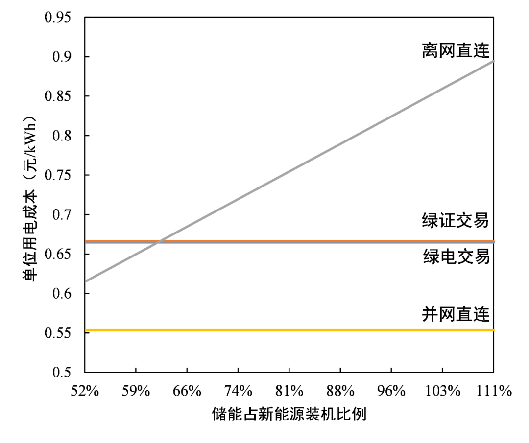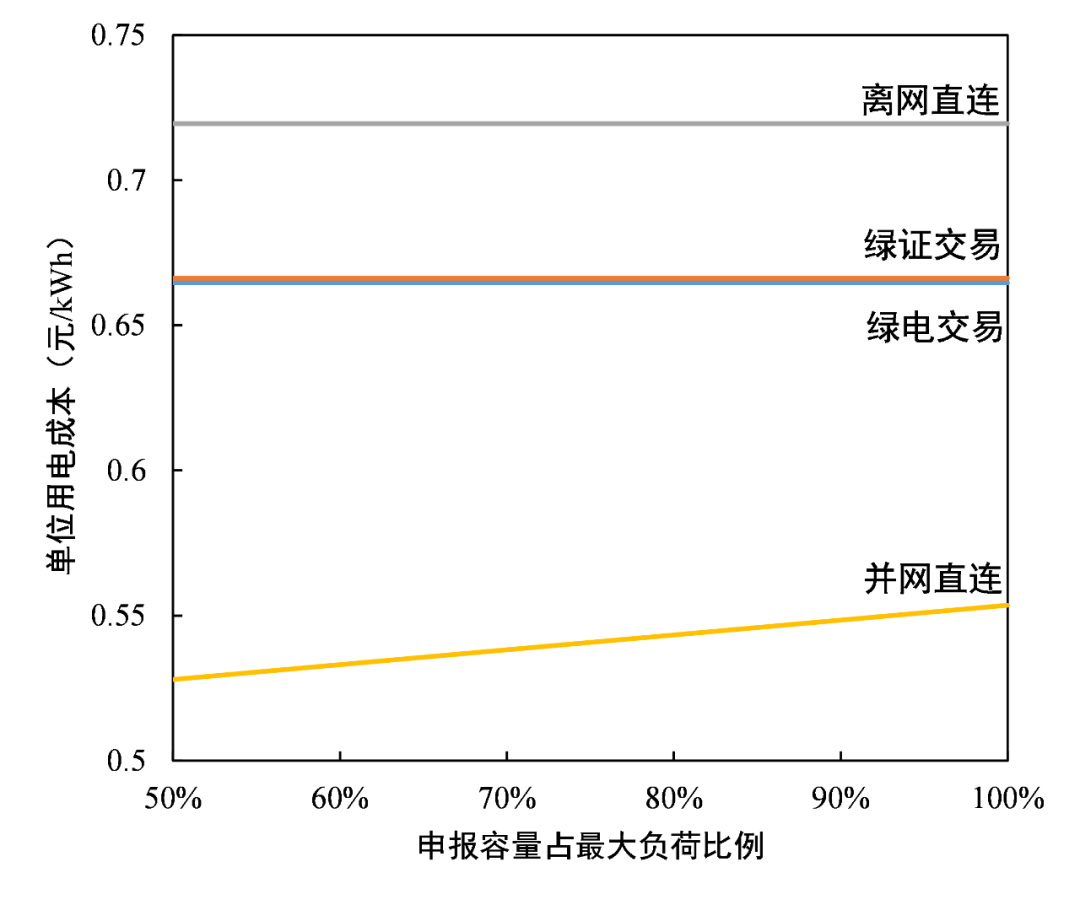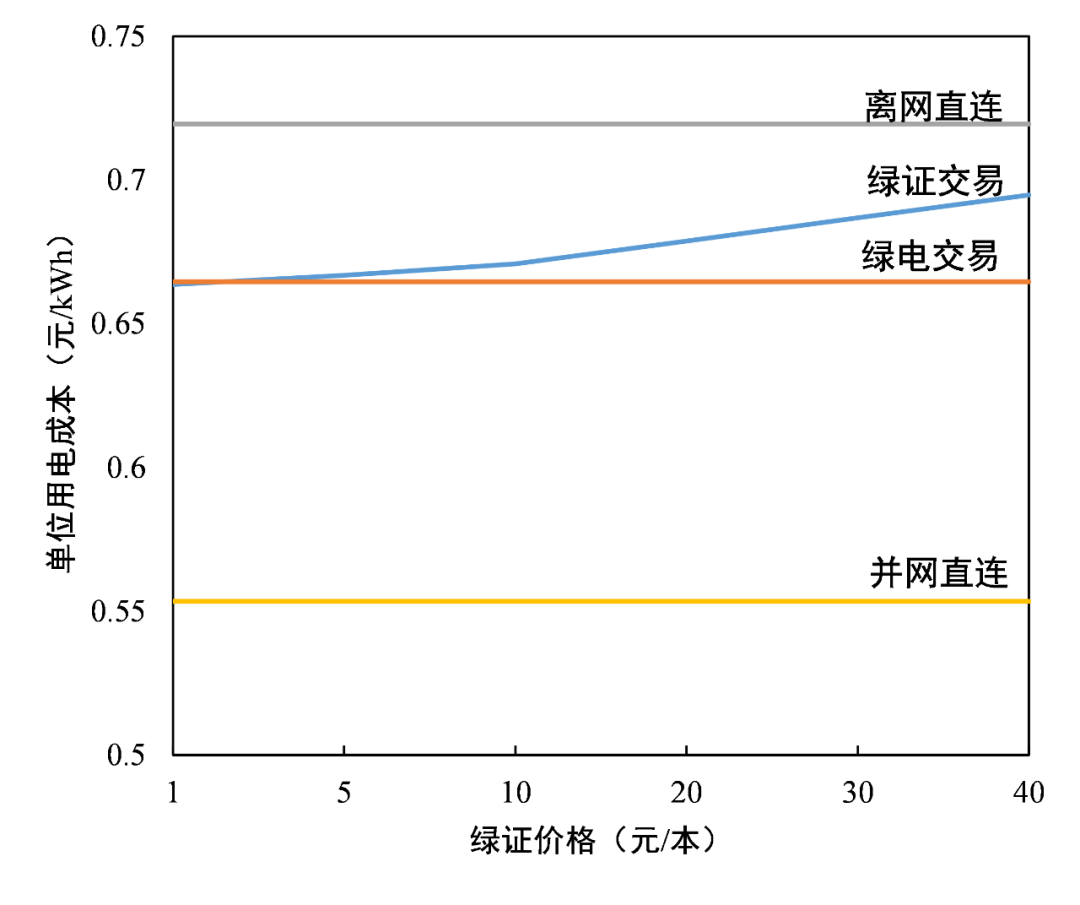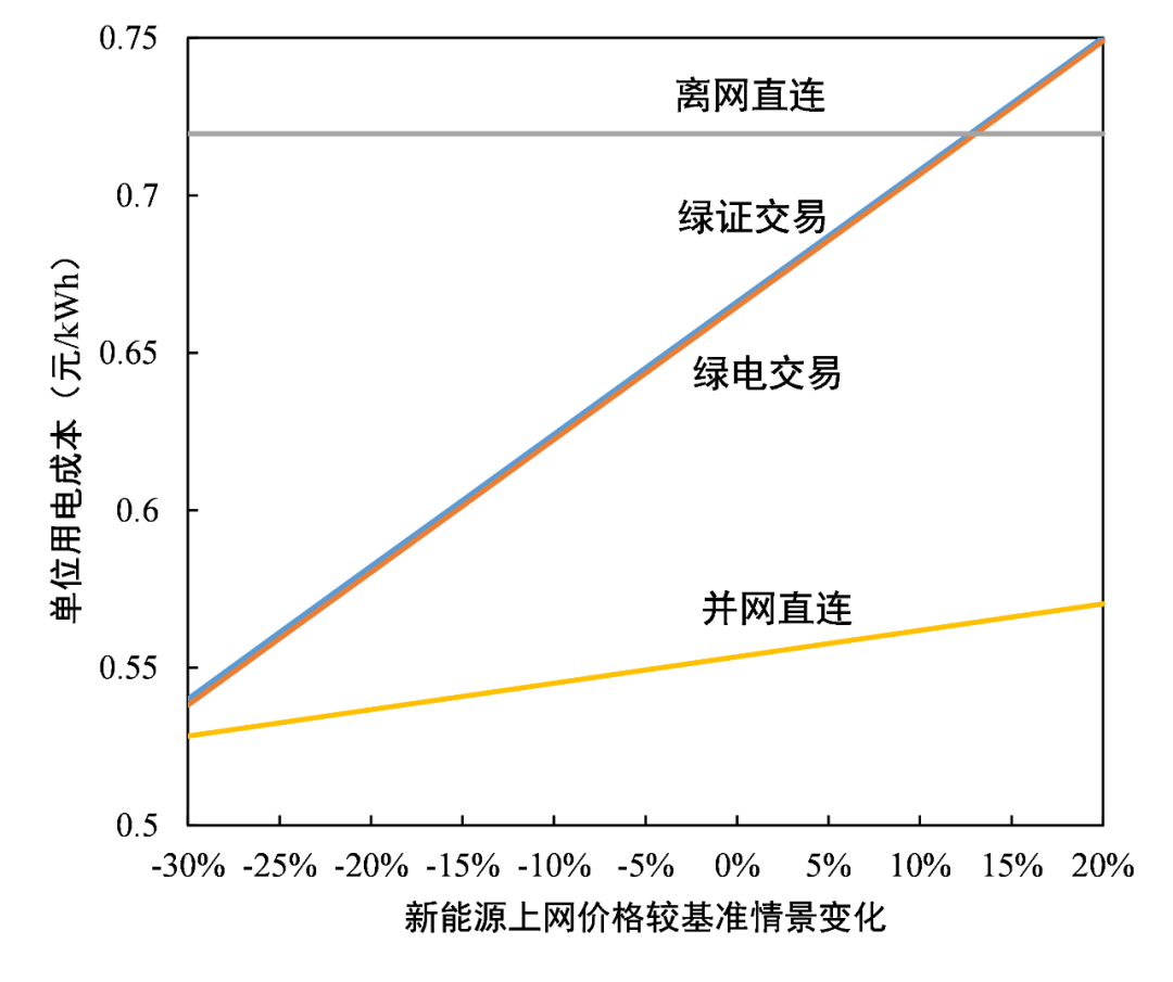 隨著綠電價格的下降,通過公共電網(wǎng)購電的三種模式單位用電成本將隨之下降。2024年,算例所在地區(qū)的新能源市場平均價格(0.4023元/千瓦時)主要對標(biāo)煤電基準(zhǔn)電價(0.372元/千瓦時),較其度電成本(風(fēng)0.2249元、光0.3594元)高79%和12%。在新能源全面入市政策推動下,若新能源交易價格實現(xiàn)下降,那么綠電、綠證交易模式將逐漸凸顯其成本優(yōu)勢(本算例新能源交易價格較2024年均價下降30%左右),并網(wǎng)型綠電直連模式的經(jīng)濟競爭力將會受到一定挑戰(zhàn)。