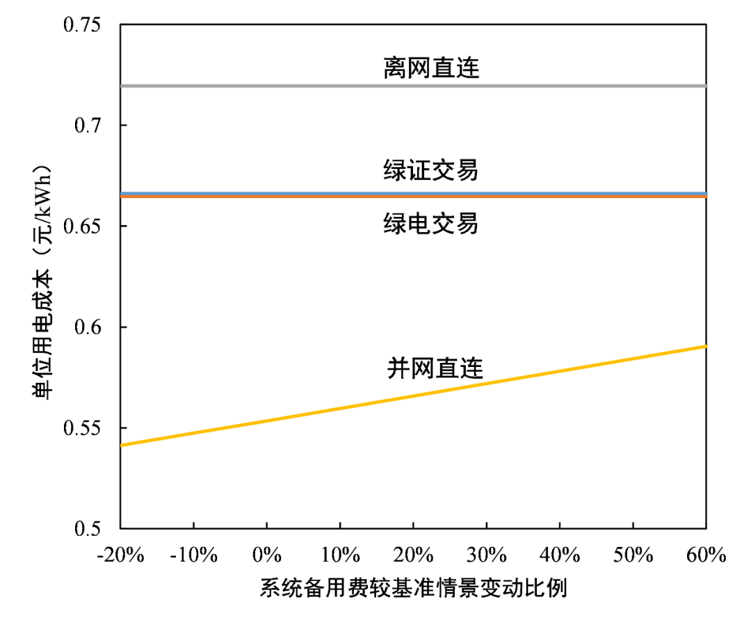 測算結(jié)果表明,在基準(zhǔn)情景的參數(shù)設(shè)定條件下,并網(wǎng)型直連模式的單位用電成本最低。該模式結(jié)合了大電網(wǎng)供電和直連模式的優(yōu)勢:一方面,借助“綠電直連”機制,數(shù)據(jù)中心可直接獲取物理可溯源的綠色電力,同時鎖定具有成本優(yōu)勢的綠電價格;另一方面,通過保留與公共電網(wǎng)的連接,數(shù)據(jù)中心可獲得電網(wǎng)備用支持,滿足調(diào)峰、備用等不確定性電力需求,顯著降低對儲能的依賴。但需要說明的是,當(dāng)前系統(tǒng)備用費收取細(xì)則尚未出臺,該測算結(jié)果是基于系統(tǒng)備用費按容(需)量電價考慮的。傳統(tǒng)容(需)量電價是基于穩(wěn)定負(fù)荷設(shè)計的,并網(wǎng)型直連項目若不配置儲能,整體負(fù)荷特性表現(xiàn)為較大的波動性(平均負(fù)荷率較低),需要電網(wǎng)頻繁為其調(diào)峰,系統(tǒng)備用成本可能升高。