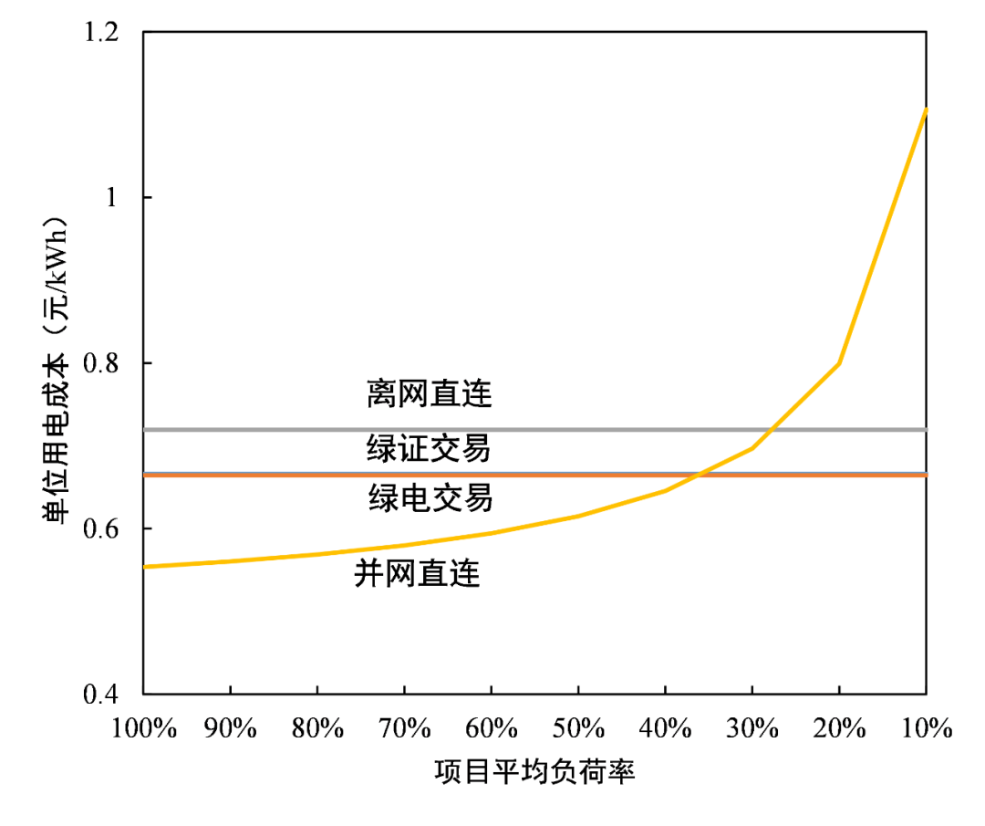 圖4上圖為在基準(zhǔn)情境下按比例調(diào)整系統(tǒng)備用費的單位用電成本變化?!锻ㄖ芬螅浞痔嵘椖快`活性調(diào)節(jié)能力,盡可能減小系統(tǒng)調(diào)節(jié)壓力。項目平均負(fù)荷率反應(yīng)了源荷作為整體的波動特性,也反應(yīng)了需要電網(wǎng)提供調(diào)節(jié)的壓力。為反映電網(wǎng)調(diào)節(jié)壓力,假定取項目平均負(fù)荷率的倒數(shù)作為系統(tǒng)備用費的費率,負(fù)荷率越接近1,需要電網(wǎng)調(diào)節(jié)的需求越低,備用費越低,反之越高。測算結(jié)果如圖4所示,在項目平均負(fù)荷率為36%時,并網(wǎng)直連模式的單位用電成本與綠電、綠證交易模式相同。
