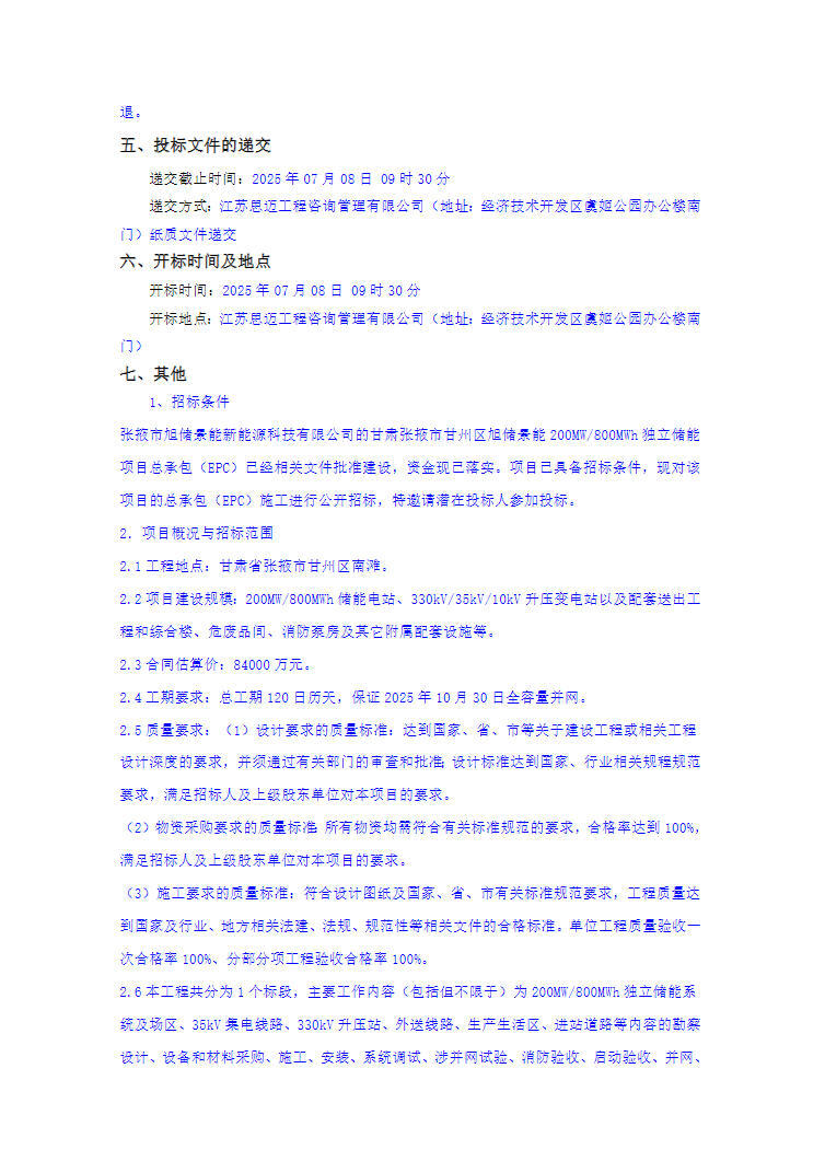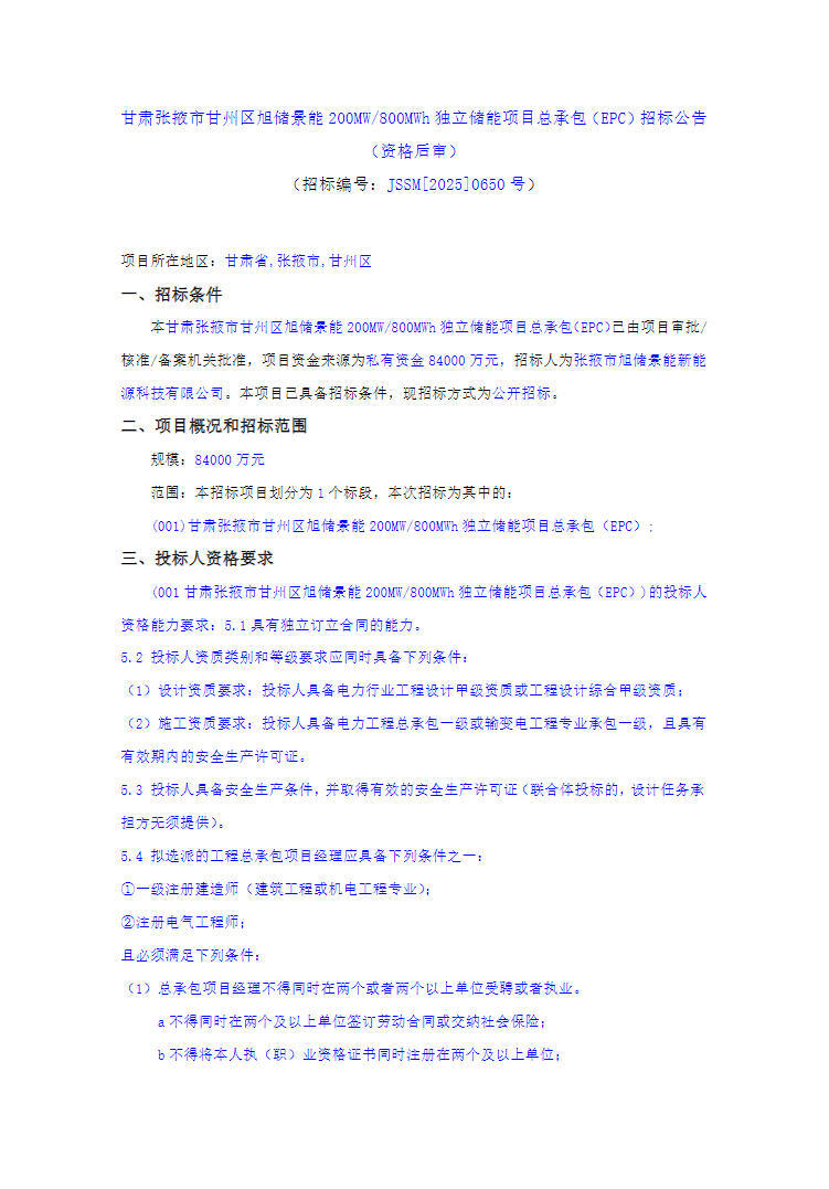 中國(guó)儲(chǔ)能網(wǎng)訊:6月18日,甘肅張掖市甘州區(qū)旭儲(chǔ)景能200MW/800MWh獨(dú)立儲(chǔ)能項(xiàng)目總承包(EPC)招標(biāo)公告發(fā)布。項(xiàng)目資金來(lái)源為私有資金84000萬(wàn)元,招標(biāo)人為張掖市旭儲(chǔ)景能新能源科技有限公司。