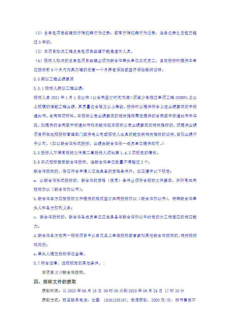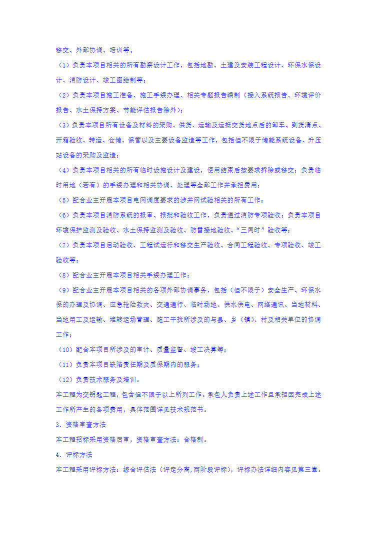 本工程共分為1個(gè)標(biāo)段,主要工作內(nèi)容(包括但不限于)為200MW/800Mwh 獨(dú)立儲(chǔ)能系統(tǒng)及場(chǎng)區(qū)、35kV集電線路、330kV升壓站、外送線路、生產(chǎn)生活區(qū)、進(jìn)站道路等內(nèi)容的勘察設(shè)計(jì)、設(shè)備和材料采購(gòu)、施工、安裝、系統(tǒng)調(diào)試、涉并網(wǎng)試驗(yàn)、消防驗(yàn)收、啟動(dòng)驗(yàn)收、并網(wǎng)、移交、外部協(xié)調(diào)、培訓(xùn)等。