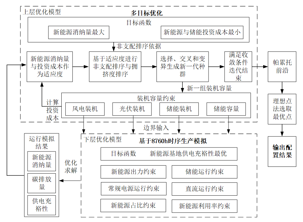 本文提出了一種基于多目標雙層優(yōu)化與8760h時序生產(chǎn)模擬的大型新能源基地風光儲容量聯(lián)合規(guī)劃方法。建立了兼顧投資經(jīng)濟性、發(fā)電清潔性和供電充裕性的多目標雙層優(yōu)化模型,上層模型優(yōu)化風光儲配置容量,下層模型開展全年8760h的運行優(yōu)化模型,考慮了受端電網(wǎng)晚高峰時段保供需求、直流通道利用率、新能源外送電量、常規(guī)電源與儲能運行等約束條件,采用NSGA-II結合時序生產(chǎn)模擬雙層優(yōu)化方法求解模型,獲取風光儲配置容量的帕累托前沿解集合,考慮投資成本、碳排放量和供電充裕性,通過理想點方法篩選出風光儲最優(yōu)配置方案?;谖覈鞅蹦承履茉椿財?shù)據(jù)開展仿真測試,驗證了方法的有效性。圖1為多目標優(yōu)化雙層規(guī)劃模型結構。