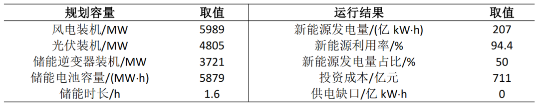 以我國西北某新能源基地場景為例進行仿真測試。系統(tǒng)最優(yōu)配置結果如表1所示:風電裝機為5989MW,光伏裝機為4805MW,儲能裝機為3721MW和5879MW·h,風光儲總投資成本711億元,新能源利用率94.4%,新能源發(fā)電量占比為50%,全年無供電缺口。