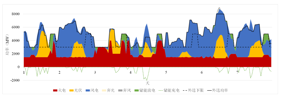 圖2展示了連續(xù)7日的基地時序運行曲線,所提出方法能夠合理優(yōu)化風-光-火-儲-直逐時段的發(fā)電運行方式,滿足了新能源高效外送消納、火電低碳運行和晚高峰時段受端電網(wǎng)保供需求,如:在第1、第3—4、第7日18:00—21:00晚高峰時段,風電出力較低,通過儲能放電和火電增加出力滿足了晚高峰保供需求;在第2、5日晚高峰18:00—21:00時段,風電大發(fā),火電降至最小技術出力;在第6日11:00—15:00時段風電和光伏同時大發(fā)時段,火電維持最小技術出力,直流已達到最大外送功率,儲能通過充電消納了大部分棄電。