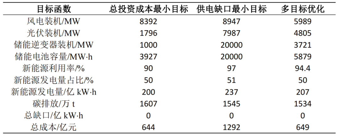 表2比較了本文的多目標優(yōu)化和單目標優(yōu)化的容量優(yōu)化配置結果??偼顿Y成本最小目標下配置的新能源裝機規(guī)模最小,但碳排放量較大,新能源發(fā)電量與利用率較低;供電缺口最小目標下,系統(tǒng)供電缺口為0,但總投資成本和火電碳排放量高于其他場景。本文所提的多目標優(yōu)化方法能夠在保證系統(tǒng)穩(wěn)定供電和新能源外送消納需求的情況下,盡可能降低風光儲投資成本和火電碳排放量,與單目標優(yōu)化配置結果相比體現(xiàn)出了很好的優(yōu)勢。