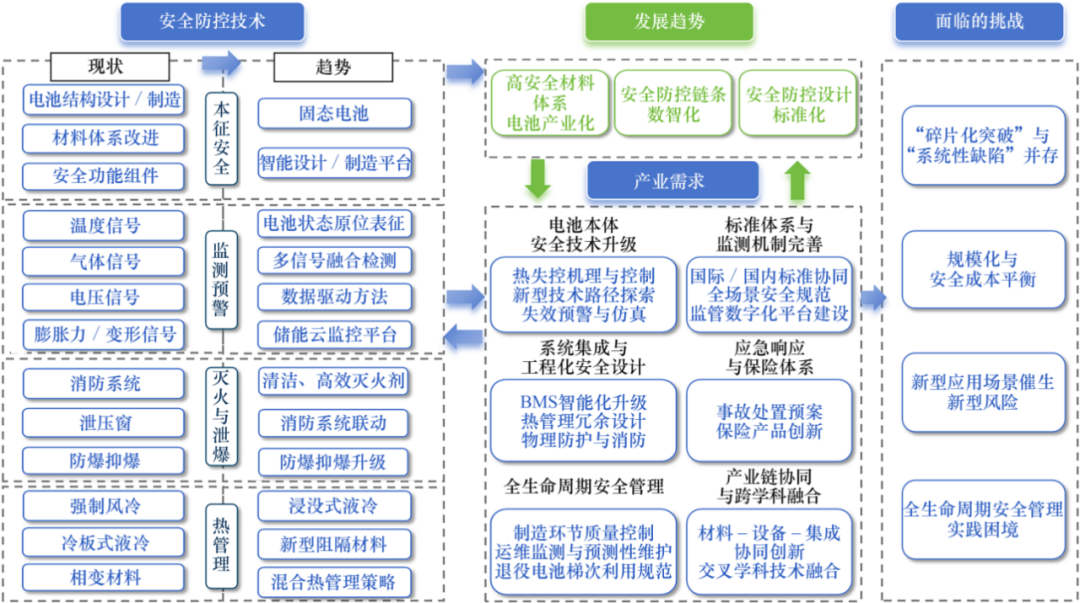 在事故誘因分析層面,研究多聚焦于電池材料失效、濫用條件等單一因素,對(duì)多物理場(chǎng)耦合作用下的跨尺度鏈?zhǔn)窖莼瘷C(jī)制缺乏動(dòng)態(tài)解析;在危險(xiǎn)性評(píng)估領(lǐng)域,針對(duì)單體電池的熱失控機(jī)理已有較成熟模型,但對(duì)模組、艙體及系統(tǒng)層級(jí)的風(fēng)險(xiǎn)傳播規(guī)律與量化評(píng)價(jià)方法仍顯不足;在防控技術(shù)方面,本征安全改性、熱管理優(yōu)化等被動(dòng)防御手段雖取得進(jìn)展,但基于數(shù)字孿生的主動(dòng)預(yù)警、多級(jí)協(xié)同阻遏等智能化防控體系尚處于探索階段。與此同時(shí),儲(chǔ)能應(yīng)用場(chǎng)景向高能量密度、分布式方向延伸,進(jìn)一步加劇了傳統(tǒng)防控技術(shù)與復(fù)雜動(dòng)態(tài)風(fēng)險(xiǎn)間的適配性挑戰(zhàn)。此外,安全防控技術(shù)評(píng)價(jià)偏重實(shí)驗(yàn)室環(huán)境下的單一技術(shù)驗(yàn)證,缺少工程場(chǎng)景下的技術(shù)集成適配性研究。為滿足政府、企業(yè)和用戶等各方主體對(duì)新型儲(chǔ)能安全性、可靠性的要求,亟需構(gòu)建儲(chǔ)能系統(tǒng)多層級(jí)安全動(dòng)態(tài)評(píng)價(jià)體系,探索各系統(tǒng)安全運(yùn)行邊界,進(jìn)而優(yōu)化整體協(xié)同工作效能。