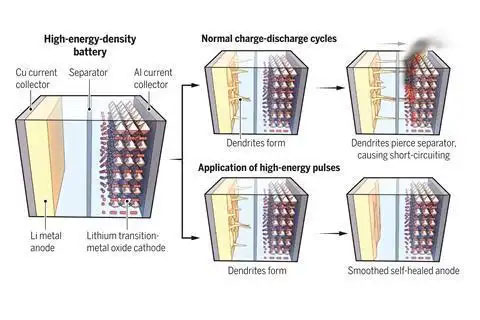 鋰電池金屬枝晶生長造成電池起火的示意圖