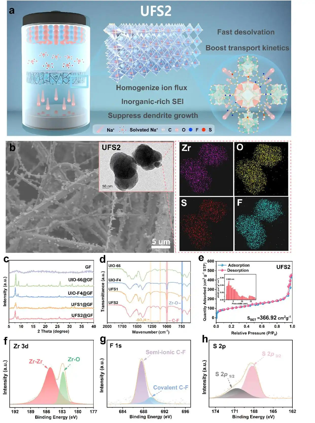 最左側(cè)為鈉金屬電池的示意圖,中間層為隔膜,放大部分為經(jīng)過修飾的MOF-UFS2結(jié)構(gòu)圖