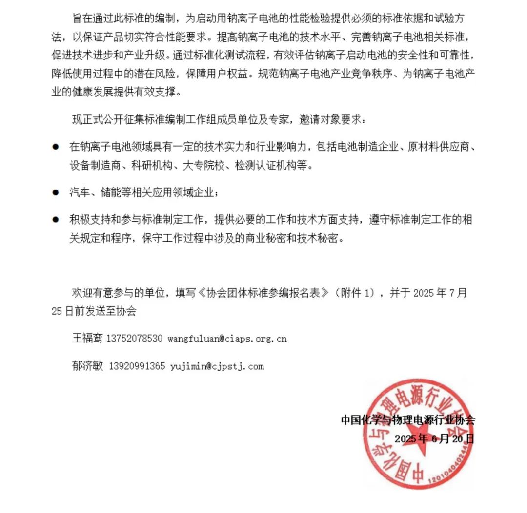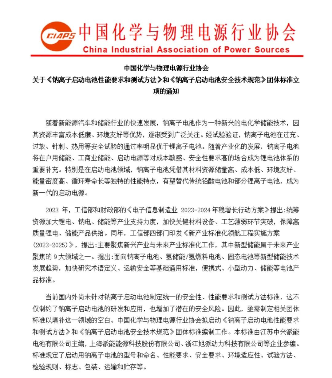 當(dāng)前國(guó)內(nèi)外尚未針對(duì)鈉離子啟動(dòng)電池制定統(tǒng)一的安全性、性能要求和測(cè)試方法標(biāo)準(zhǔn),這不僅制約了鈉離子啟動(dòng)電池的研發(fā)和應(yīng)用,也增加了潛在的安全風(fēng)險(xiǎn)。因此,亟需制定相關(guān)團(tuán)體標(biāo)準(zhǔn)以填補(bǔ)這一領(lǐng)域的空白。中國(guó)化學(xué)與物理電源行業(yè)協(xié)會(huì)擬啟動(dòng)《鈉離子啟動(dòng)電池性能要求和測(cè)試方法》和《鈉離子啟動(dòng)電池安全技術(shù)規(guī)范》團(tuán)體標(biāo)準(zhǔn)編制工作。本標(biāo)準(zhǔn)由江蘇中興派能電池有限公司主編,上海派能能源科技股份有限公司、浙江旭派動(dòng)力科技有限公司等企業(yè)參編。標(biāo)準(zhǔn)規(guī)定了啟動(dòng)用鈉離子電池的型號(hào)和命名、性能要求、安全要求、環(huán)境適應(yīng)性、試驗(yàn)方法、檢驗(yàn)規(guī)則、標(biāo)志、包裝、運(yùn)輸和貯存等。