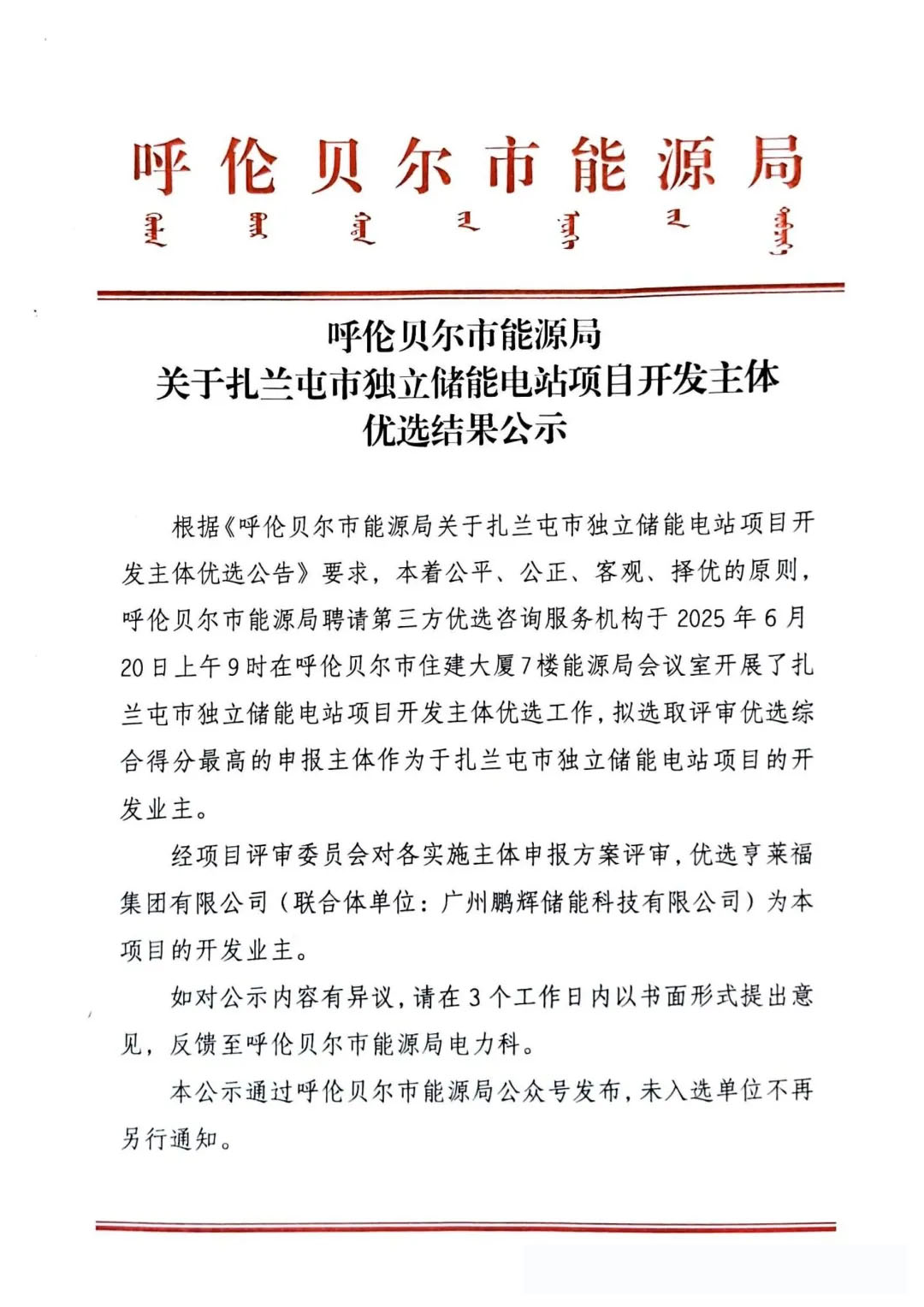 中國(guó)儲(chǔ)能網(wǎng)訊:6月23日,呼倫貝爾市能源局發(fā)布關(guān)于扎蘭屯市獨(dú)立儲(chǔ)能電站項(xiàng)目開(kāi)發(fā)主體優(yōu)選結(jié)果公示。