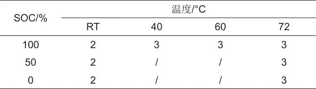 本工作中實(shí)驗(yàn)對(duì)象為磷酸鐵鋰單體電池,外形為18650圓柱形,額定容量為1.15 Ah,標(biāo)稱電壓為3.2 V,設(shè)計(jì)充電上限電壓為3.65 V,放電截止電壓為2.5 V。電池正極活性材料為磷酸鐵鋰,負(fù)極活性材料為石墨。實(shí)驗(yàn)控制變量為影響鋰離子電池電化學(xué)性能關(guān)鍵因素:環(huán)境溫度和荷電狀態(tài)SOC。實(shí)驗(yàn)條件及相應(yīng)電池樣品數(shù)量設(shè)置如表1所示。樣品命名方式為L(zhǎng)FP-X/YSOC,其中X(℃)為環(huán)境溫度,Y(%)為荷電狀態(tài)。