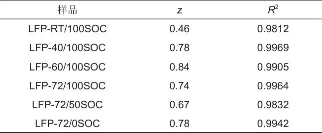 擬合結(jié)果如圖3所示,除室溫滿電存儲(chǔ)的樣品(LFP-RT/100SOC)外,其他磷酸鐵鋰電池樣品線性擬合曲線近似平行,即斜率z值近乎相同。表2擬合結(jié)果顯示,LFP-RT/100SOC電池樣品的z值為0.46(z≈0.5),這說明在室溫條件下,滿電LFP電池在存儲(chǔ)過程中其性能衰減可能主要是源于SEI膜的自然生長(zhǎng)過程,即石墨陽極表面嵌鋰與電解液之間的副反應(yīng);而在其他工況條件下,z值均明顯大于0.5(0.67≤z≤0.84),這表明在這些工況下電池性能衰減機(jī)制可能更為復(fù)雜。