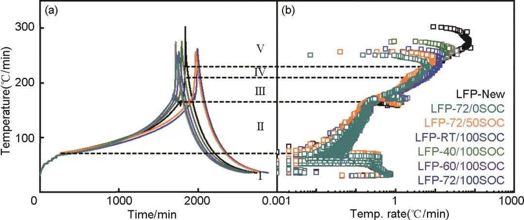 進(jìn)一步對(duì)磷酸鐵鋰電池單體的熱安全性進(jìn)行了研究,在絕熱環(huán)境中通過設(shè)備加熱來引發(fā)電池自發(fā)熱并最終觸發(fā)電池?zé)崾Э?。結(jié)果如圖5所示,新鮮電池樣品LFP-New的熱失控反應(yīng)表現(xiàn)最為劇烈,其熱失控最高溫度TMAX最大,達(dá)302.6 ℃,熱失控最大溫升速率(dT/dt)MAX最高,達(dá)79 ℃/min;然而,經(jīng)過不同條件存儲(chǔ)之后,該型磷酸鐵鋰電池的熱安全性均有不同程度的提升,體現(xiàn)在其主要熱失控特性參數(shù)TMAX和(dT/dt)MAX均有所下降。圖5(b)顯示磷酸鐵鋰電池?zé)崾Э販厣俾蔬^程表現(xiàn)出明顯的分階段特征,本工作中將電池?zé)崾Э貏澐譃?個(gè)階段,其中:階段I為“加熱-等待-搜尋”階段,此過程中儀器腔內(nèi)溫度呈階梯式上升,為電池提供熱量;階段II為電池自加熱階段(自加熱至泄壓閥打開);階段III為電池快速自加熱階段;階段IV為電池?zé)崾Э仉A段;階段V為熱失控結(jié)束降溫階段。