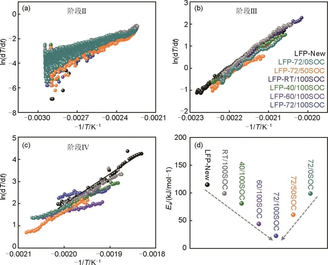 圖7 LFP電池?zé)崾Э?(a) 階段II、(b) 階段III及(c) 階段IV的ln(dT/dt)與-1/T線性擬合曲線,(d) 階段IV熱失控過程表觀活化能Ea變化圖