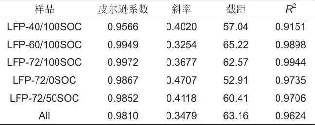 表4 LFP電池樣品SOH與特征峰強(qiáng)相關(guān)性擬合結(jié)果