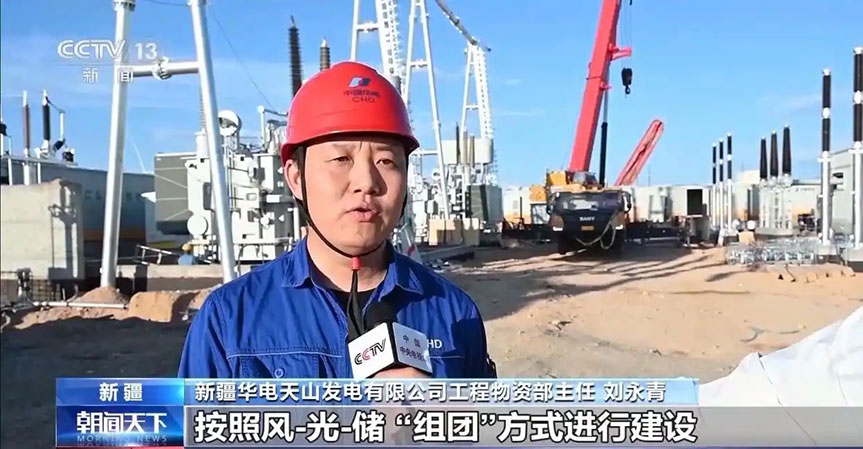 新疆華電天山發(fā)電有限公司工程物資部主任 劉永青:項目采用風(fēng)光同場布置,按風(fēng)-光-儲“組團”方式建設(shè),同步建設(shè)8座220KV匯集站,是國內(nèi)首個“風(fēng)光火儲”一體化運行控制新能源項目。