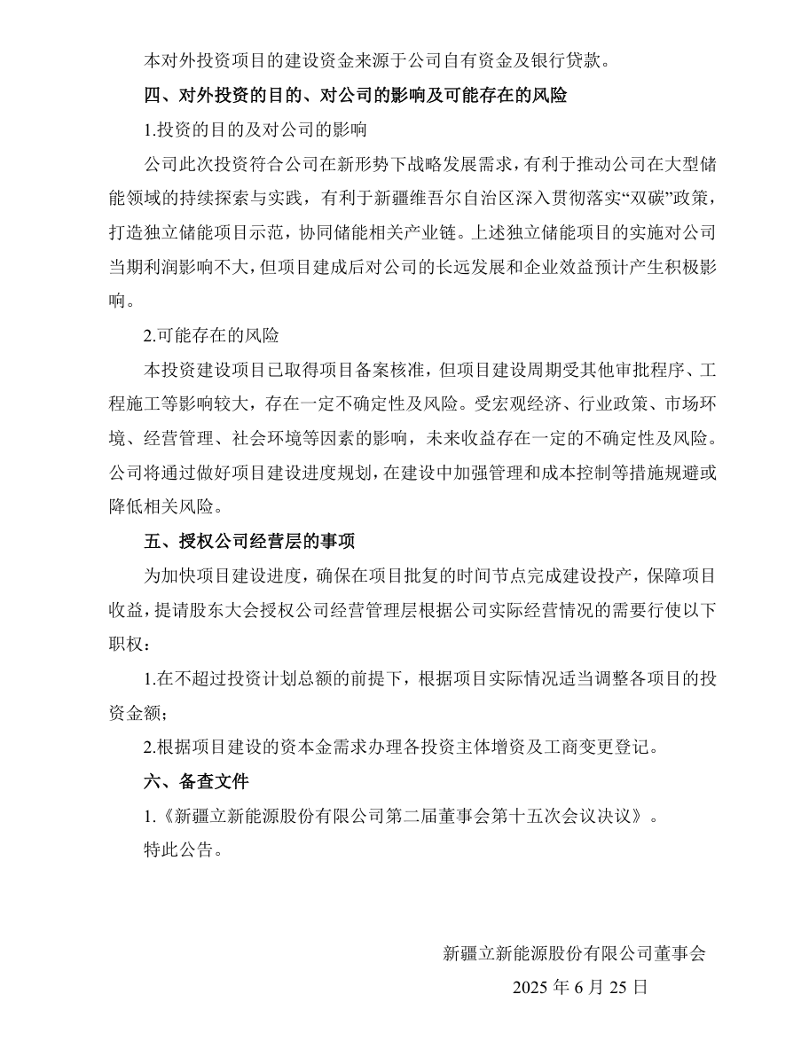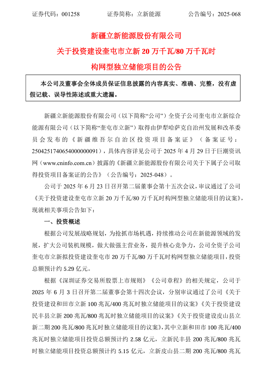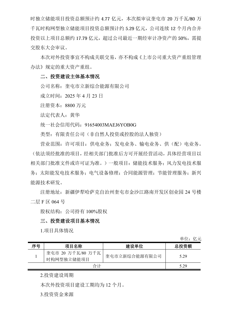 此前,公司于6月3日分別審議通過了公司《關(guān)于投資建設(shè)和田市立新100兆瓦/400兆瓦時(shí)獨(dú)立儲能項(xiàng)目的議案》《關(guān)于投資建設(shè)民豐縣立新200兆瓦/800兆瓦時(shí)獨(dú)立儲能項(xiàng)目的議案》《關(guān)于投資建設(shè)皮山縣立新二期200兆瓦/800兆瓦時(shí)獨(dú)立儲能項(xiàng)目的議案》,其中立新和田市100兆瓦/400 兆瓦時(shí)獨(dú)立儲能項(xiàng)目投資總額預(yù)計(jì)約2.58億元,立新民豐縣200兆瓦/800兆瓦時(shí)獨(dú)立儲能項(xiàng)目投資總額預(yù)計(jì)約5.15億元,立新皮山縣二期200兆瓦/800兆瓦時(shí)獨(dú)立儲能項(xiàng)目投資總額預(yù)計(jì)約4.77億元。算上此次奎屯市20萬千瓦/80萬千瓦時(shí)構(gòu)網(wǎng)型獨(dú)立儲能項(xiàng)目,公司連續(xù)12個月內(nèi)合并投資以上項(xiàng)目總額約17.79億元。