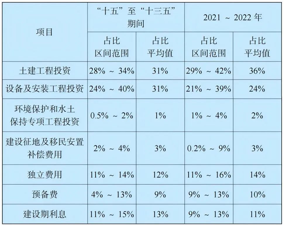 從表1可以看出,電站土建工程投資呈上升趨勢;得益于我國機(jī)電設(shè)備水平不斷提升,設(shè)備及安裝工程投資占比下降;近年來環(huán)境保護(hù)要求日益提高,環(huán)境保護(hù)和水土保持專項(xiàng)工程投資占比略有上升;獨(dú)立費(fèi)和預(yù)備費(fèi)占比略有上升;利率水平不斷下降的情況下,建設(shè)期利息占比有所下降。成本結(jié)構(gòu)變化趨勢是合理的。